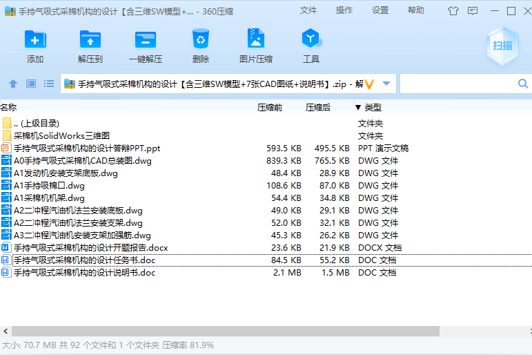 手持气吸式采棉机构的设计【含三维SW+7张CAD图纸+说明书】(ID:1226799)