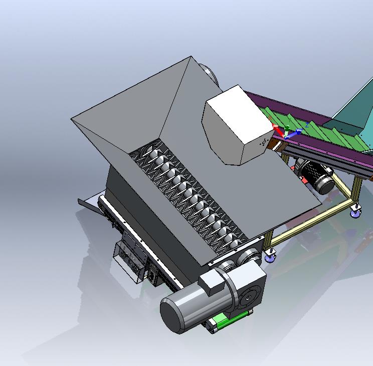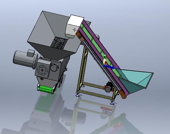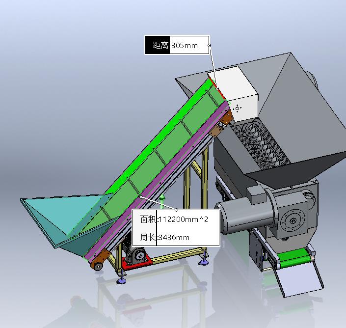 PVC皮带提升机将塑料由低工作位,提升至破碎机中;破碎机有两侧双驱动驱动两转轴实现塑料的破碎,破碎粉末由下方输送机运输走。提升高度1160mm,提升水平距离1144mm;输送宽度305mm。
