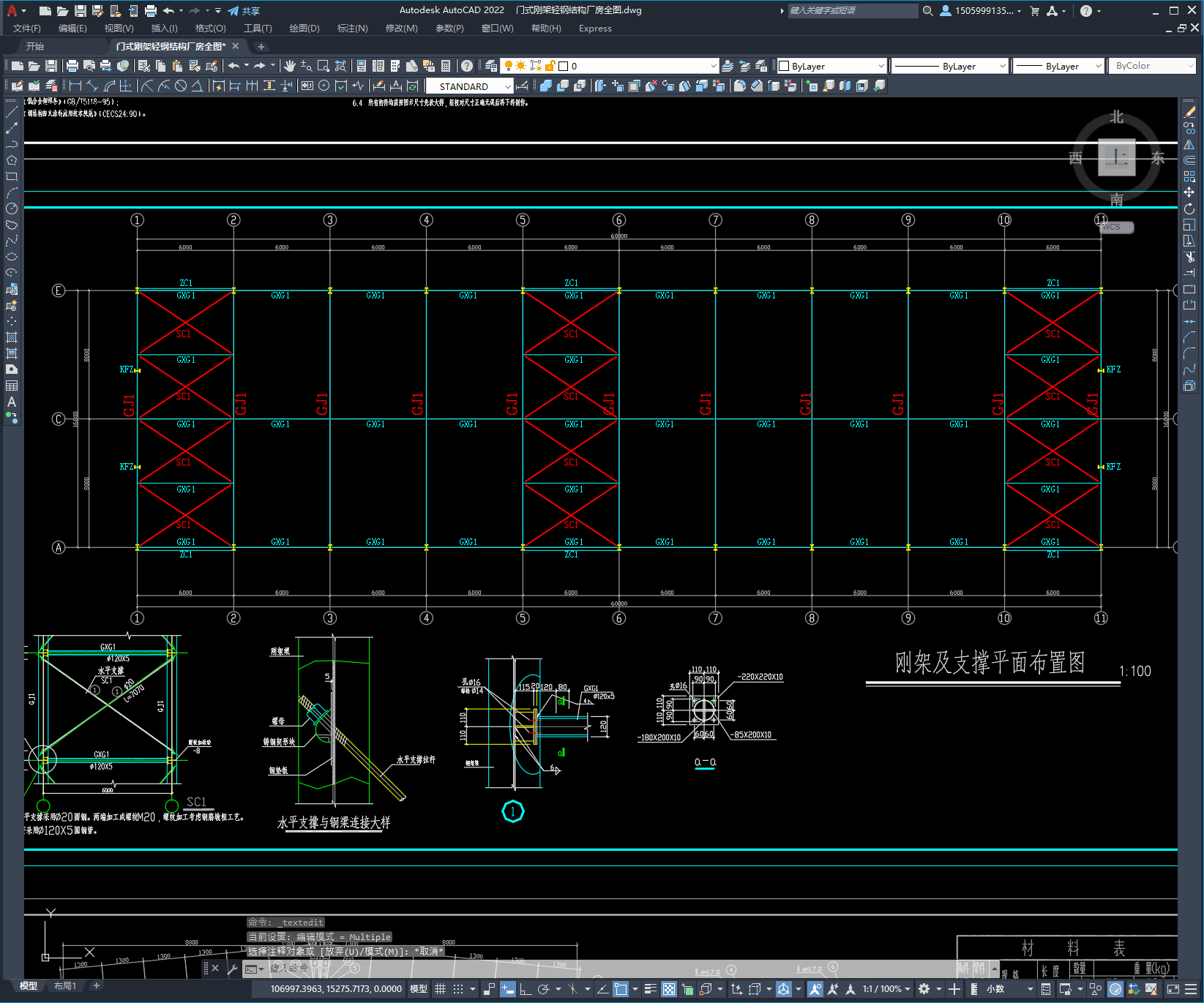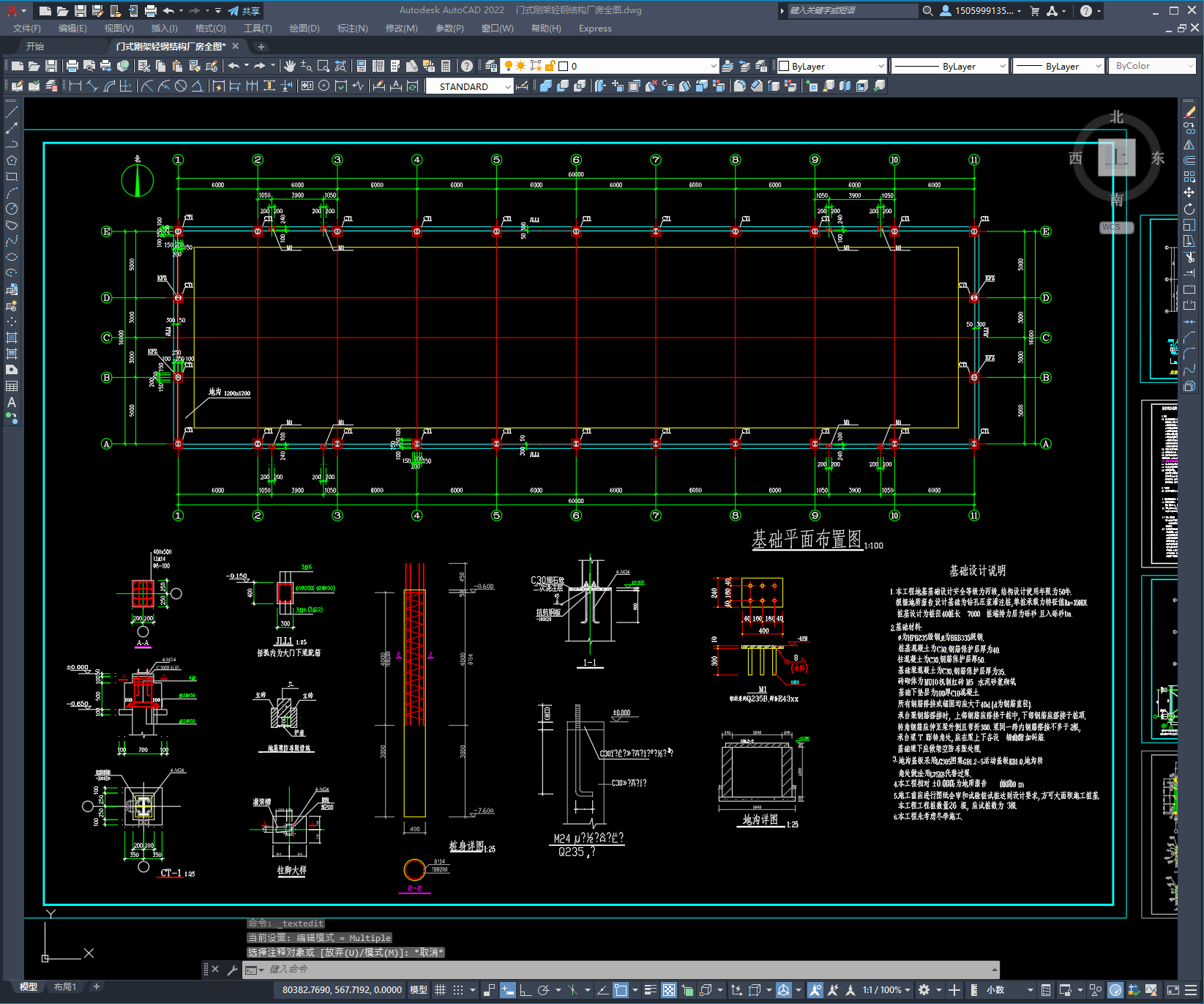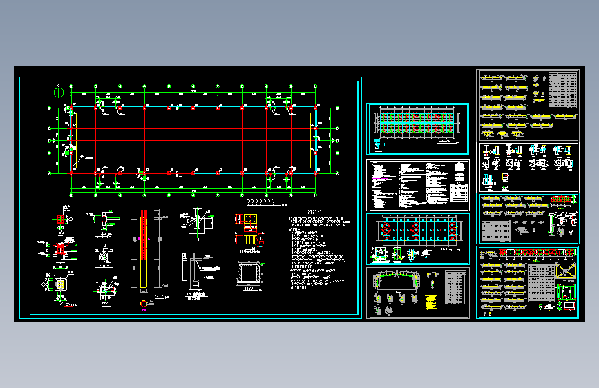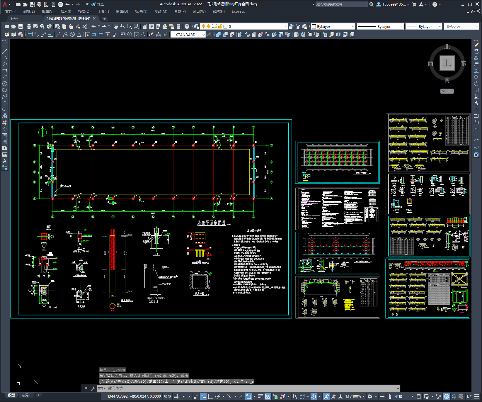 主体结构为单层轻型钢结构门式刚架结构体系,跨度为16m,柱距为6m,无吊车。图纸10张,包括:基础布置图、锚栓布置图、屋面檩条布置图、屋面支撑布置图、柱间支撑布置图、墙面檩条布置图、钢架详图及构件详图等