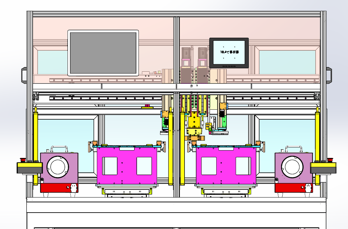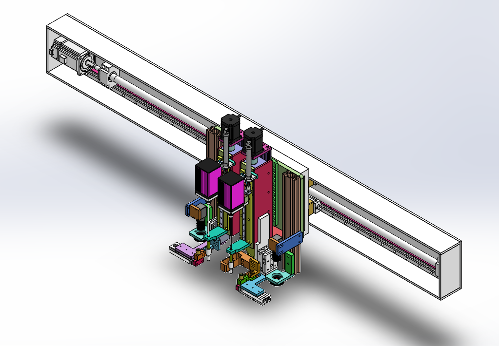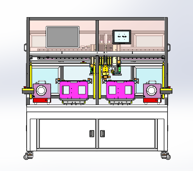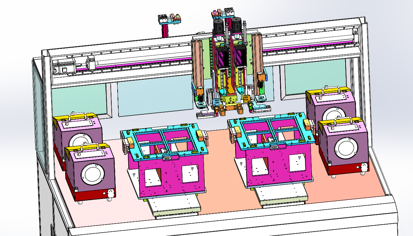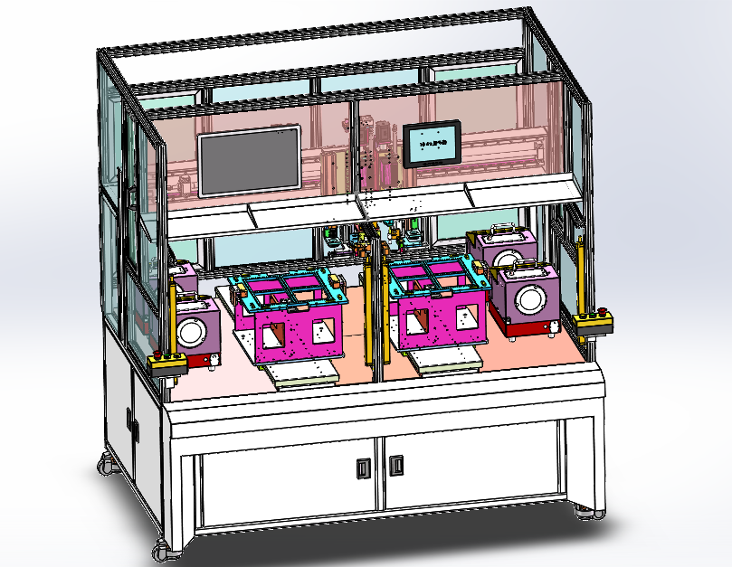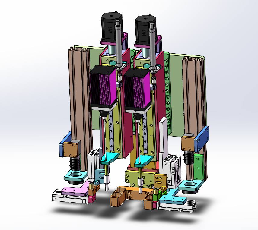 自动打螺丝机 设计思路:设备可以通用自动打螺丝,可以更换产品夹具,设备可以切换多种螺丝规格。打螺丝机装备了双伺服电批,双工位夹具。 自动打螺丝机结构介绍:主体机架部分、安全防护栏、双伺服电批模组、双工位自动打螺丝夹具、电批运动模组、夹具运动模组、自动供螺丝机、螺丝切换工装和电气控制系统组成,各组件结构具体构造如下: 1,主体机架部分:由底板、铝型材机架组成; 2,安全防护栏:由安全光栅和铝型材机架组成; 3,双伺服电批模组:由伺服电批、滑台模组组成; 4,电批运动模组:由X轴运动模组组成; 5,夹具运动模组:由Y轴运动组成; 6,自动供螺丝机:由夹紧工装、气缸组成。 程序控制系统:设备有5个气