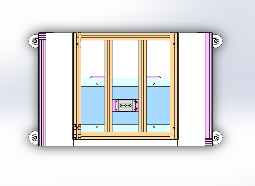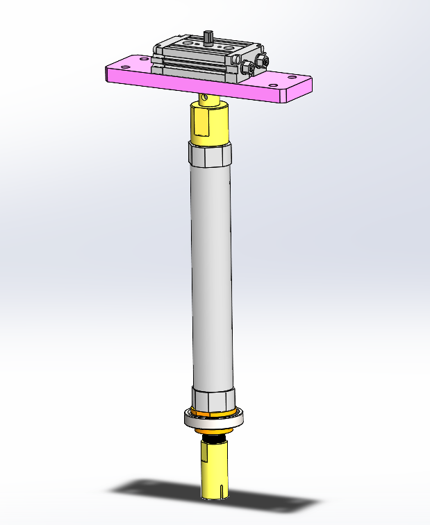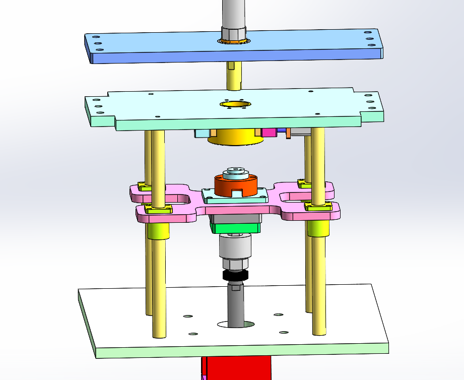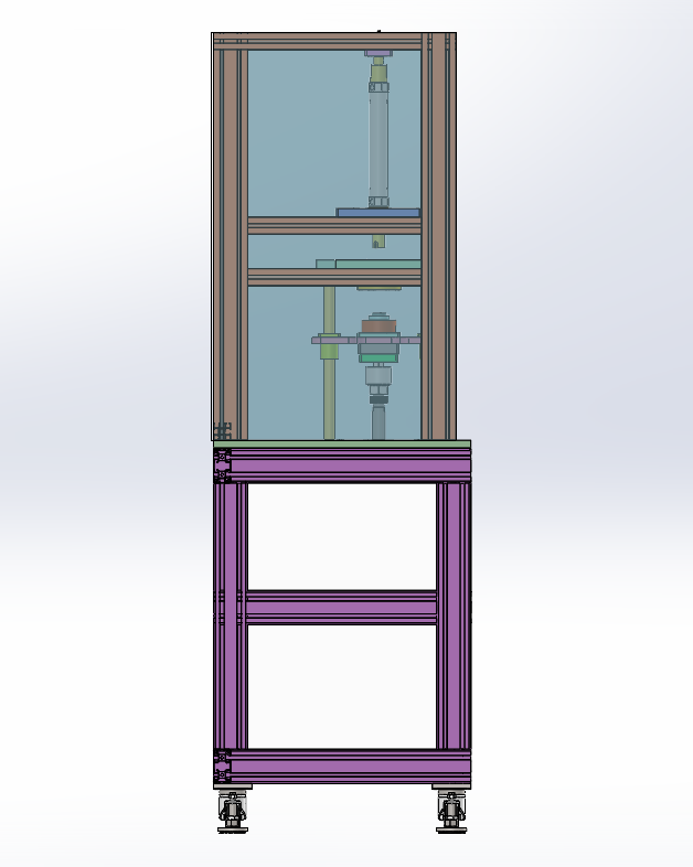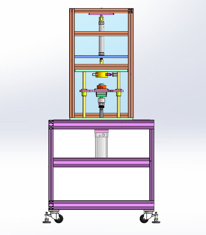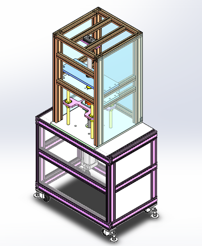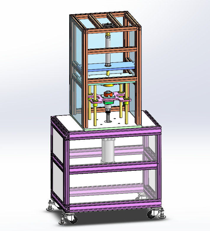 汽车燃油泵泵芯铝壳压装机 设计思路:用于压装燃油泵泵芯铝壳,并且旋转实现固定锁紧泵芯组件。铝壳用于固定泵芯里面的磁瓦片,设备上方是夹具组件,用于夹紧铝壳;夹具组件上方是旋转机构,用于旋转锁定泵芯组件;下方是压装组件,用于固定泵芯组件。 汽车燃油泵泵芯铝壳压装机结构介绍:铝型材机架及防护罩部分、压装组件、铝壳固定夹具、泵芯旋转锁定机构和电气配件构成。 1、铝型材架子:由40*40铝型材组装而成; 2、压装组件:由固定底座、导柱直线轴承和气缸组成; 3、铝壳固定夹具;由铝壳定位座、夹板和气缸组成; 4、泵芯旋转锁定机构:由旋转压头、气缸和旋转气缸组成。 工作原理:人工把铝壳固定在上方的固定夹具上,