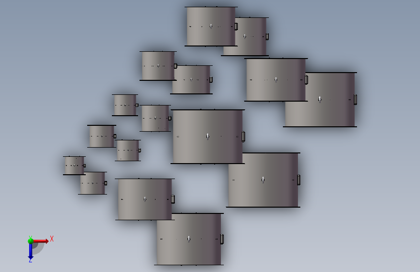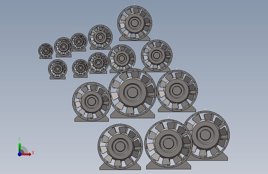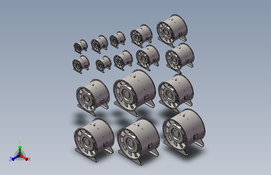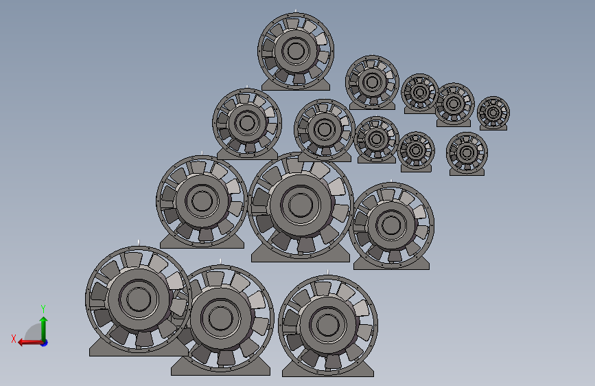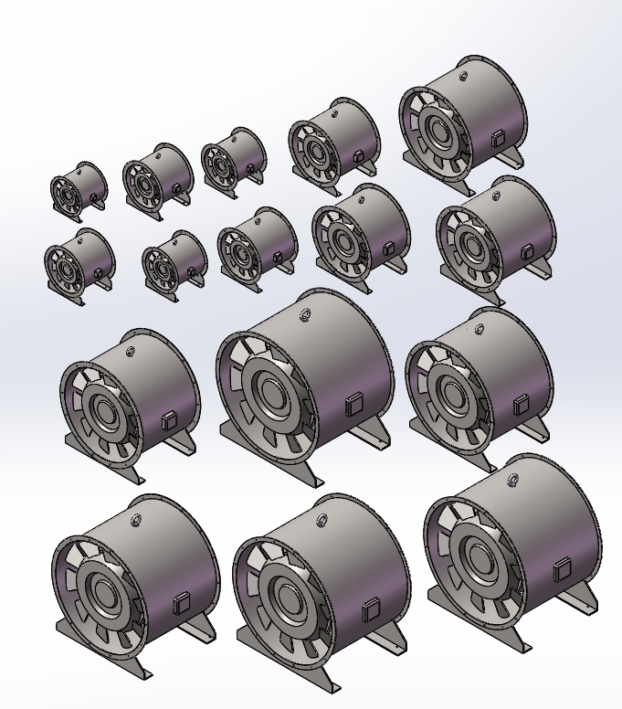 本图为:混流风机3d模型,型号: SWF型,共计: 16款,机号:3.5至13,功率(kW):0.25-30kw,流速(m³/h) 2045~84386,全型号,