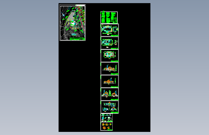 设计说明、门窗统计表、门窗详图、平面图、地下层平面图、屋顶平面图、立面图、剖面图、卫生间详图、玻璃采光顶详图、玻璃雨棚详图、金顶详图共10张图纸;