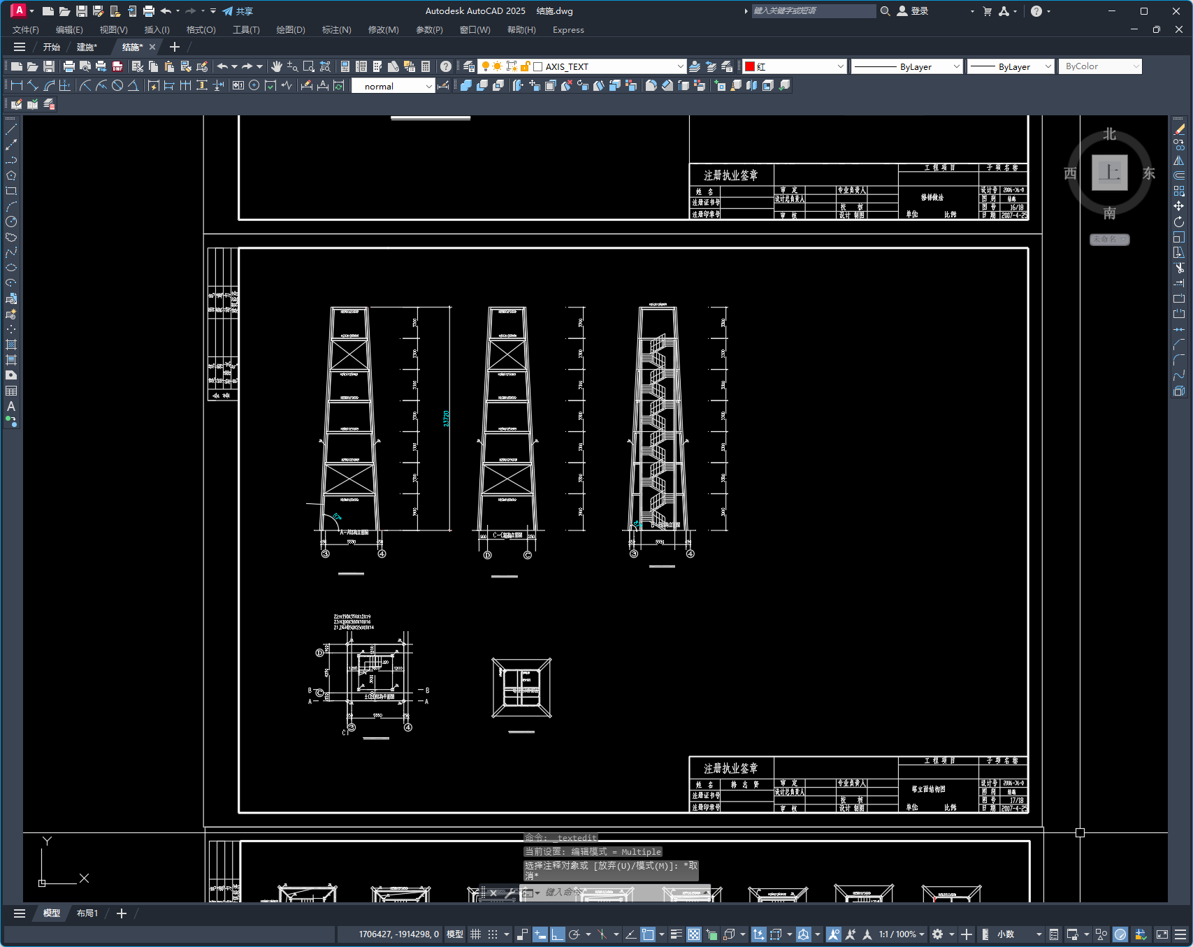 钢结构设计与施工说明、基础平面布置图、基础大样图、预埋件平面布置图、柱网平面布置图、结构平面布置图、夹层结构平面布置图、结构钢筋布置图、夹层结构钢筋布置图、梁柱接点图、楼梯做法、塔立面结构图、塔平面结构图、玻璃雨棚分割图共18张图纸。