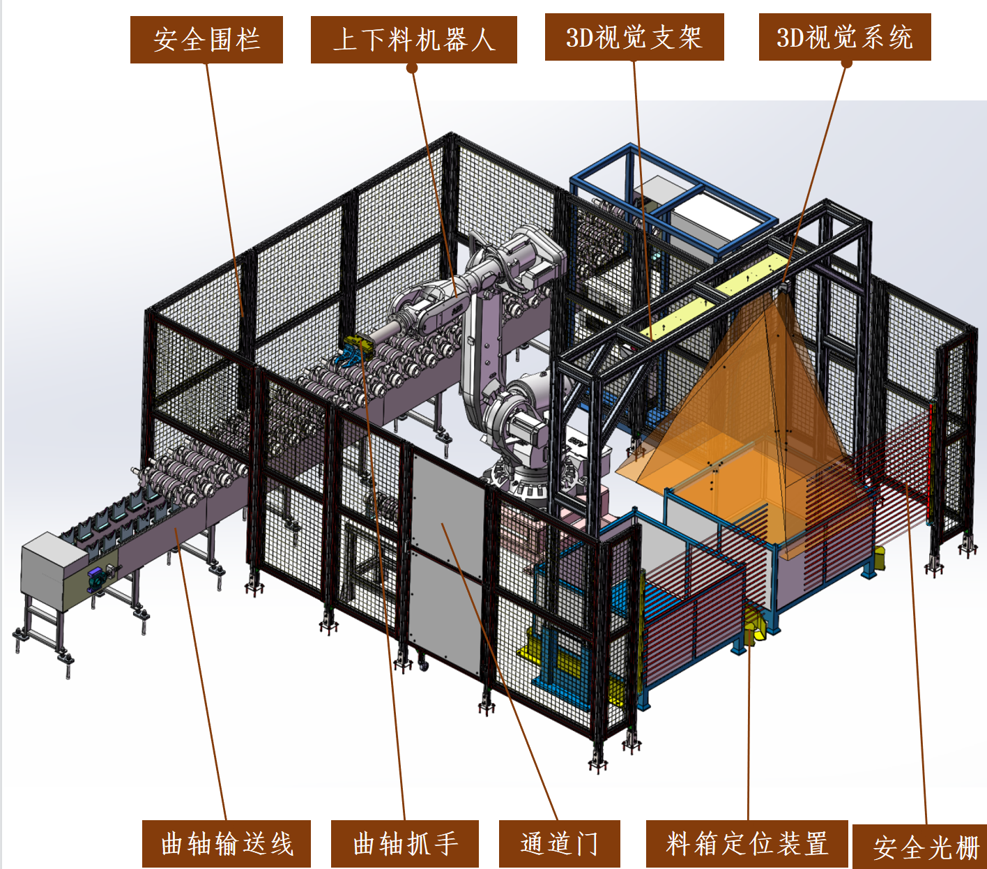 3D视觉拍照,确认曲轴在料箱中的姿态,通过软件算法计算,传输给拆垛机器人;