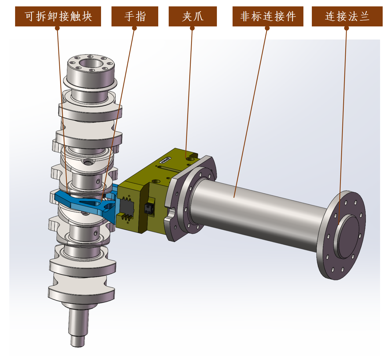 机器人从二次定位台上换向精准抓取曲轴,放到曲轴输送线的工装治具上;