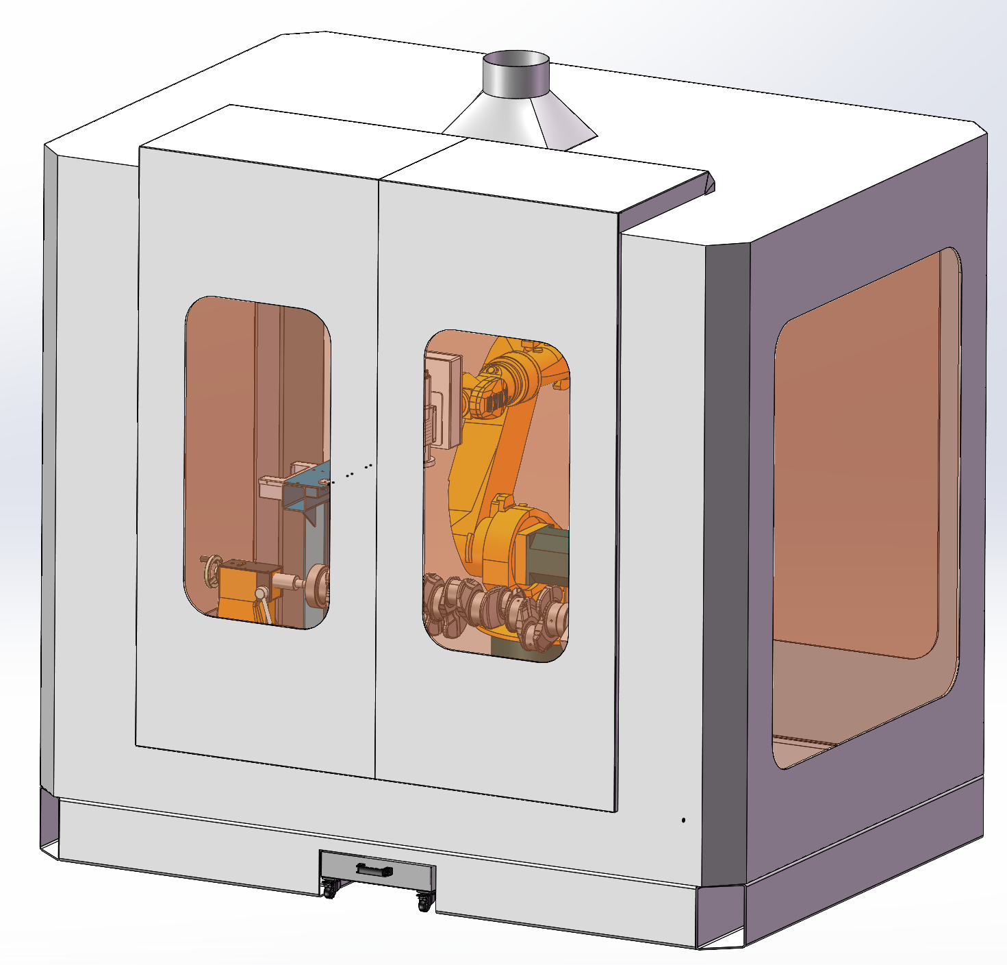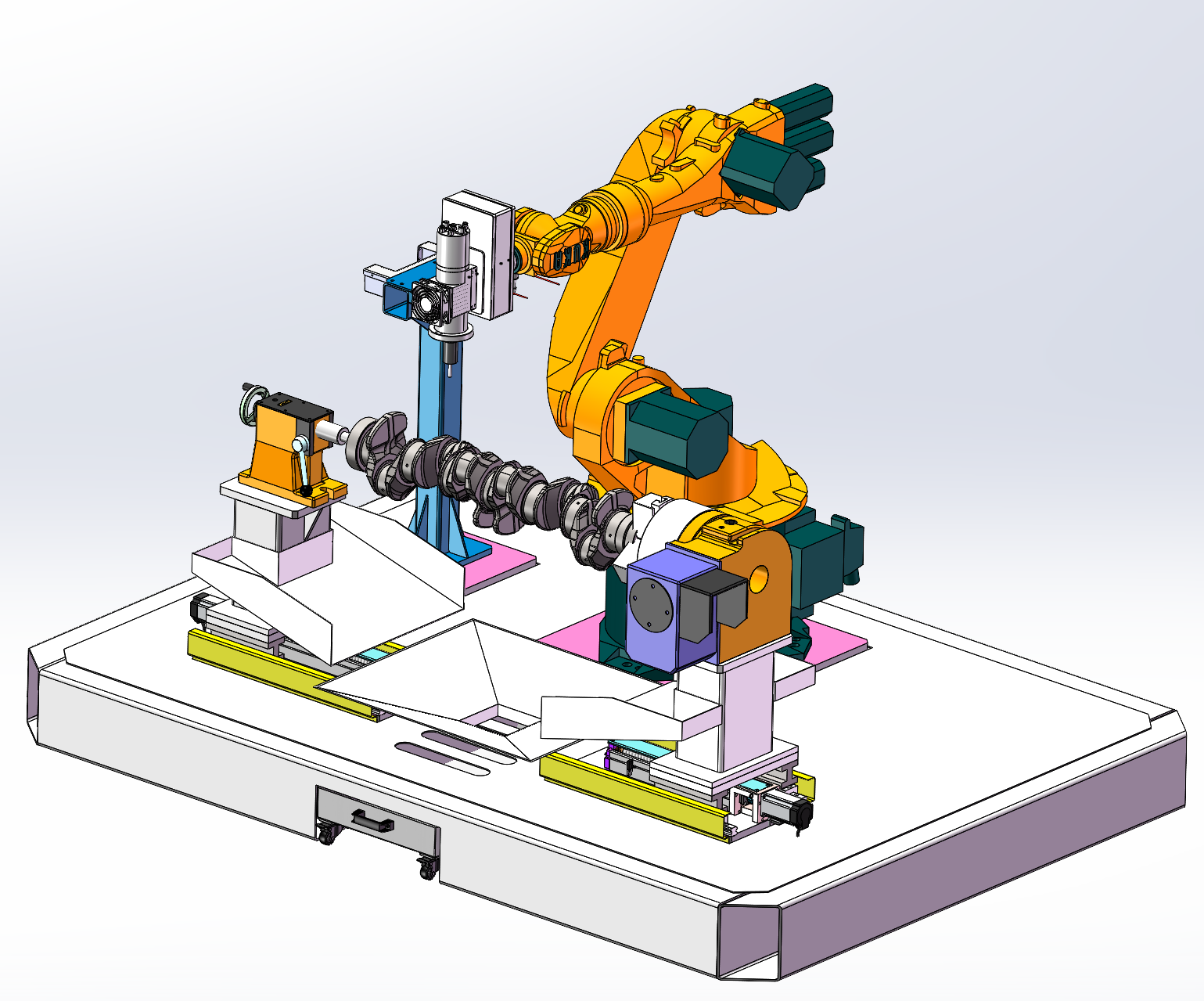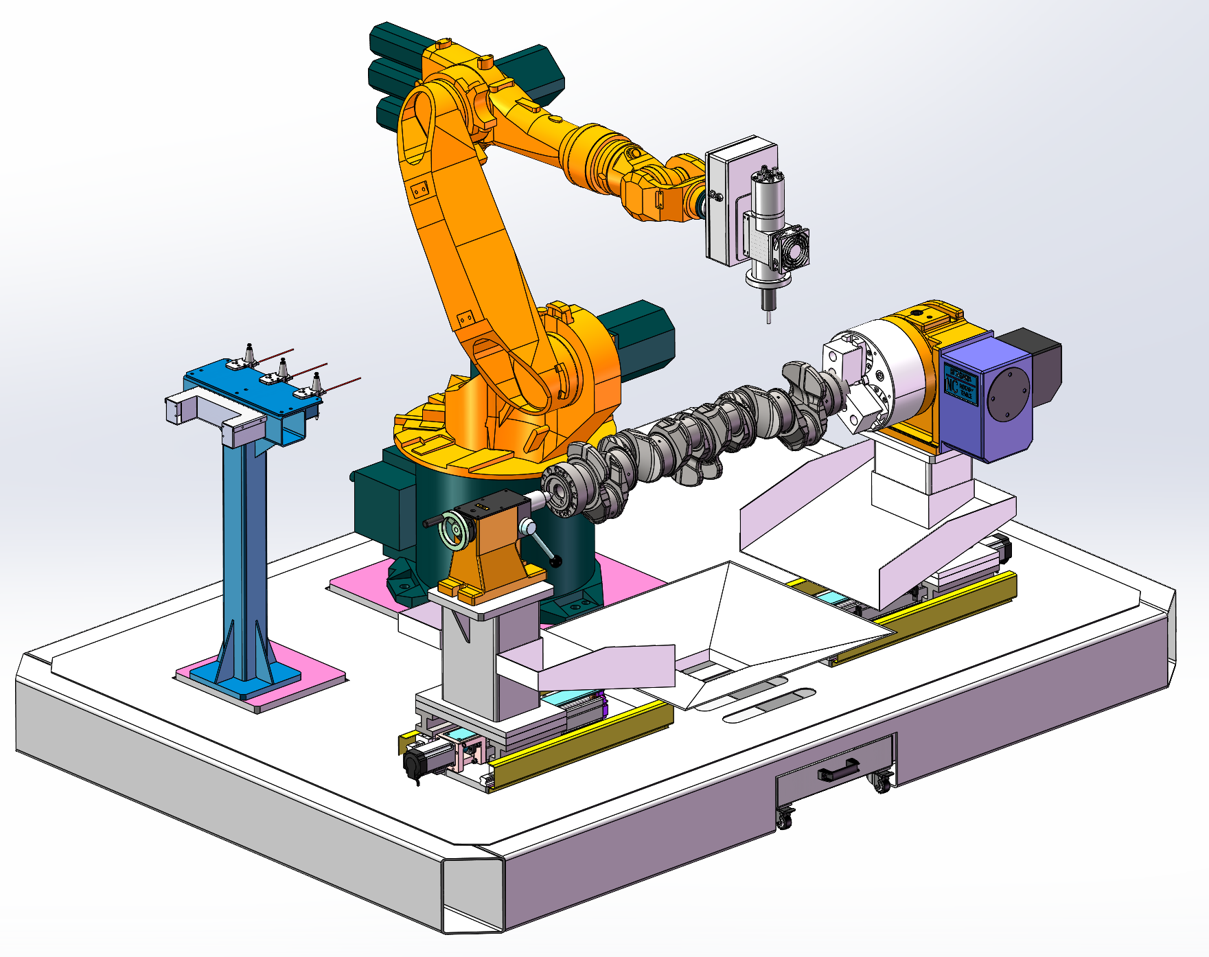 曲轴打磨去毛刺, 自动化机械手臂打磨工作站,用于发动机曲轴的自动化去毛刺打磨使用,通过旋转变位机来装夹曲轴工件配合机械手来进行毛刺的打磨,打磨采用六轴机械手携带打磨机进行