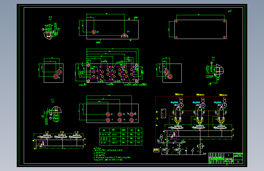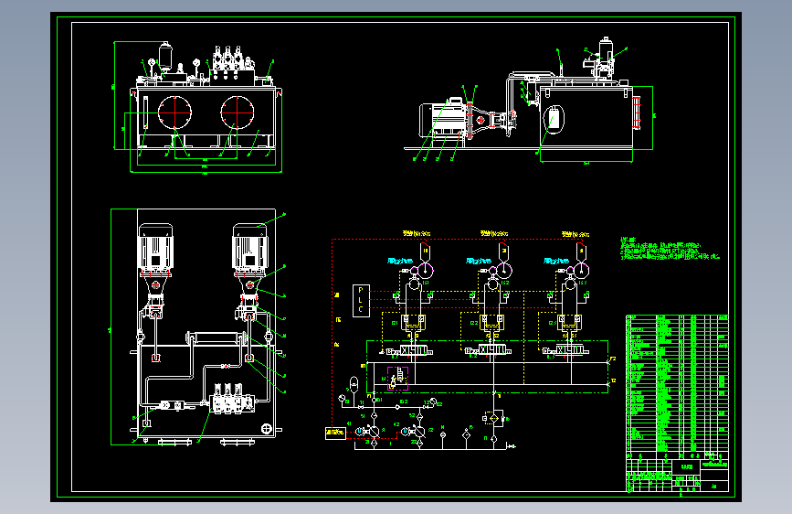 650KW潮流能独立变桨液压系统,包含二维泵站总装配图,阀块零件图,油箱焊合图和液压系统原理图设计,包含设计书和开题。系统压力:20MPa 系统流量:180L/min 轮毂直径:1.8m 叶片最大转速:15度/s 单片桨叶力矩:23KN.m 叶片数:3