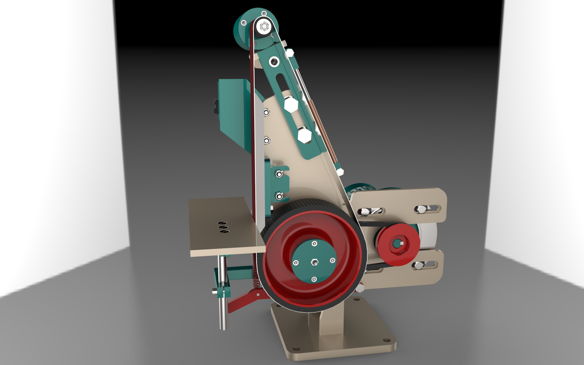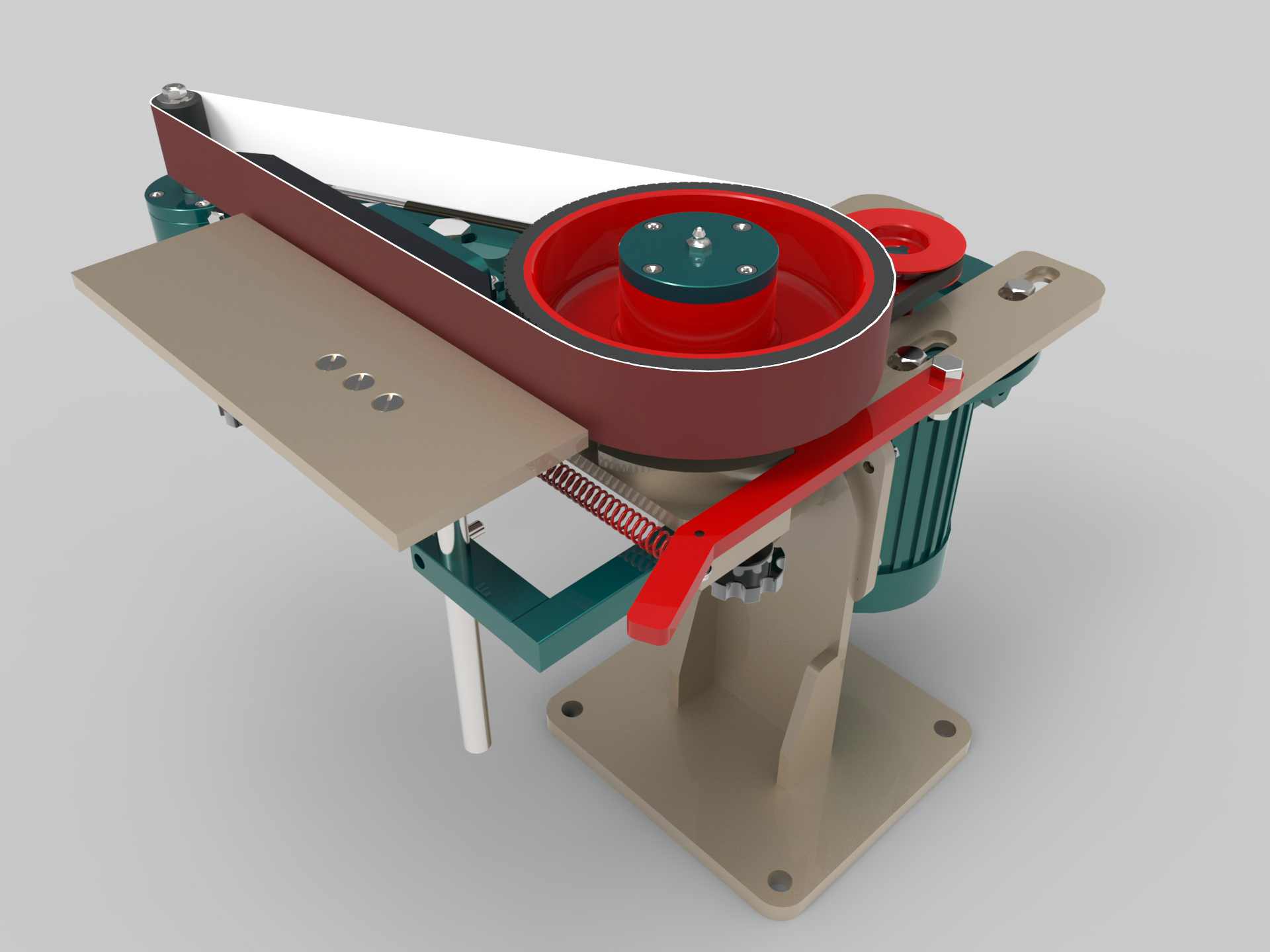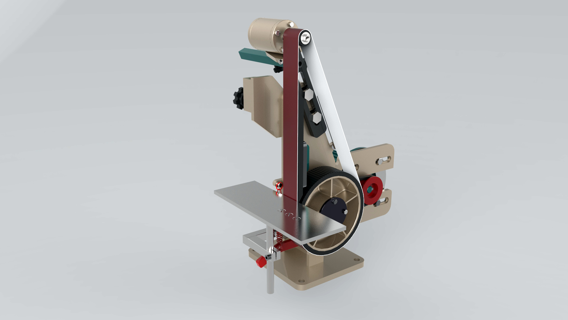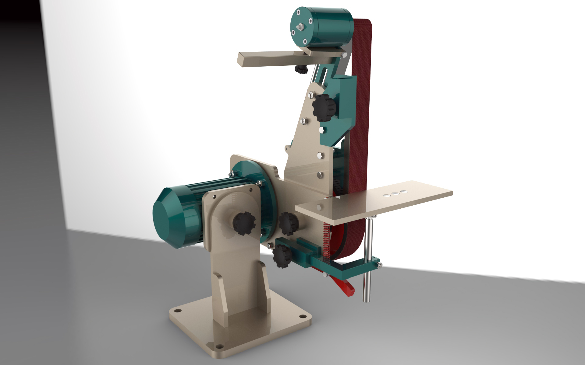 这是一套砂带机模型,这套砂带机有立姿和卧姿两种姿态模式可供调节使用。