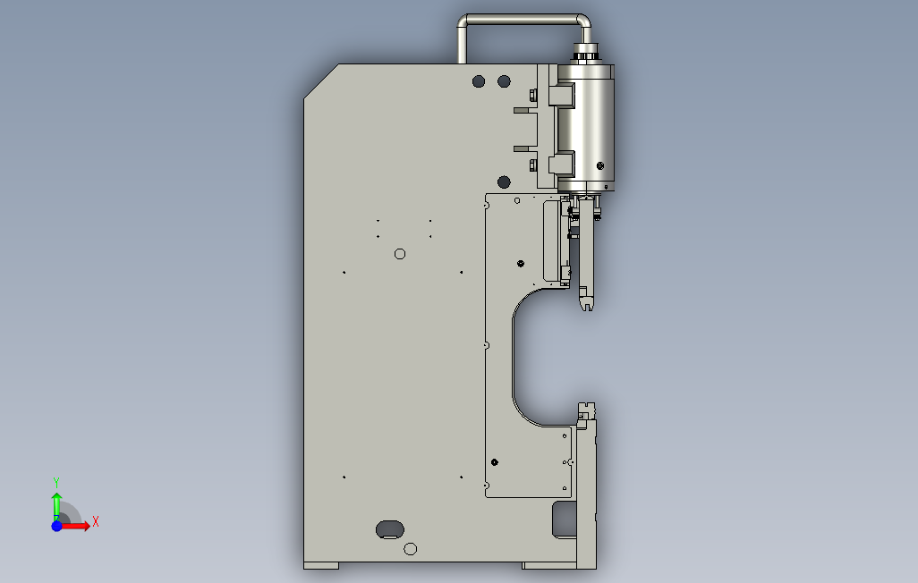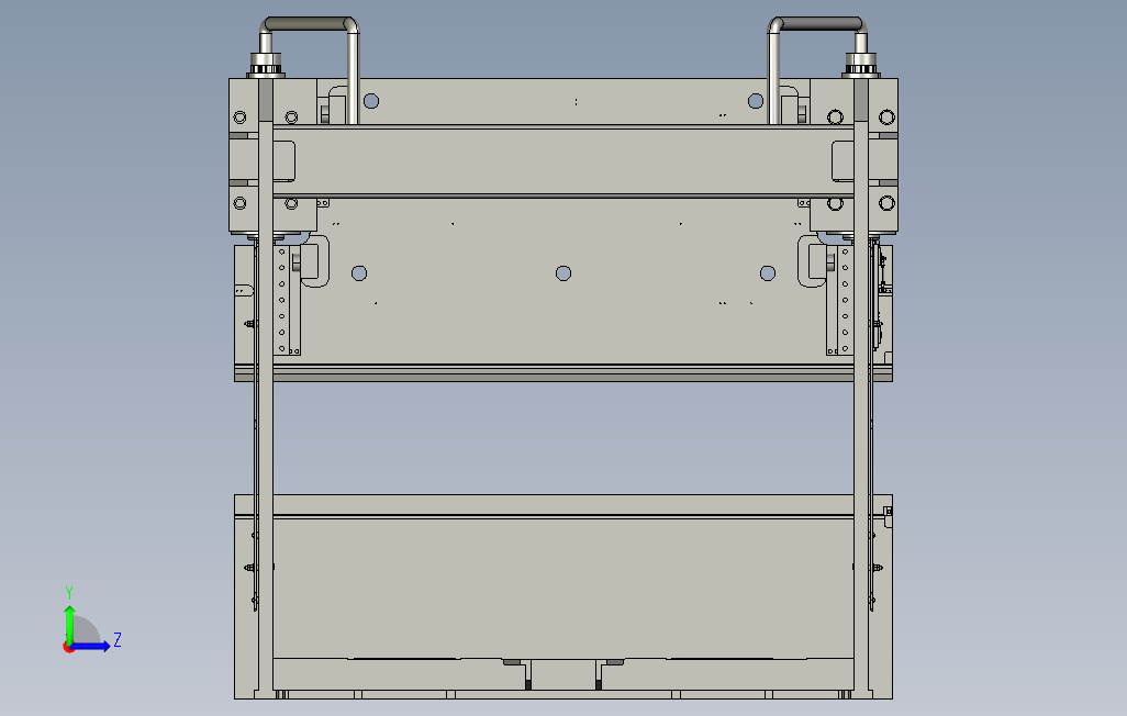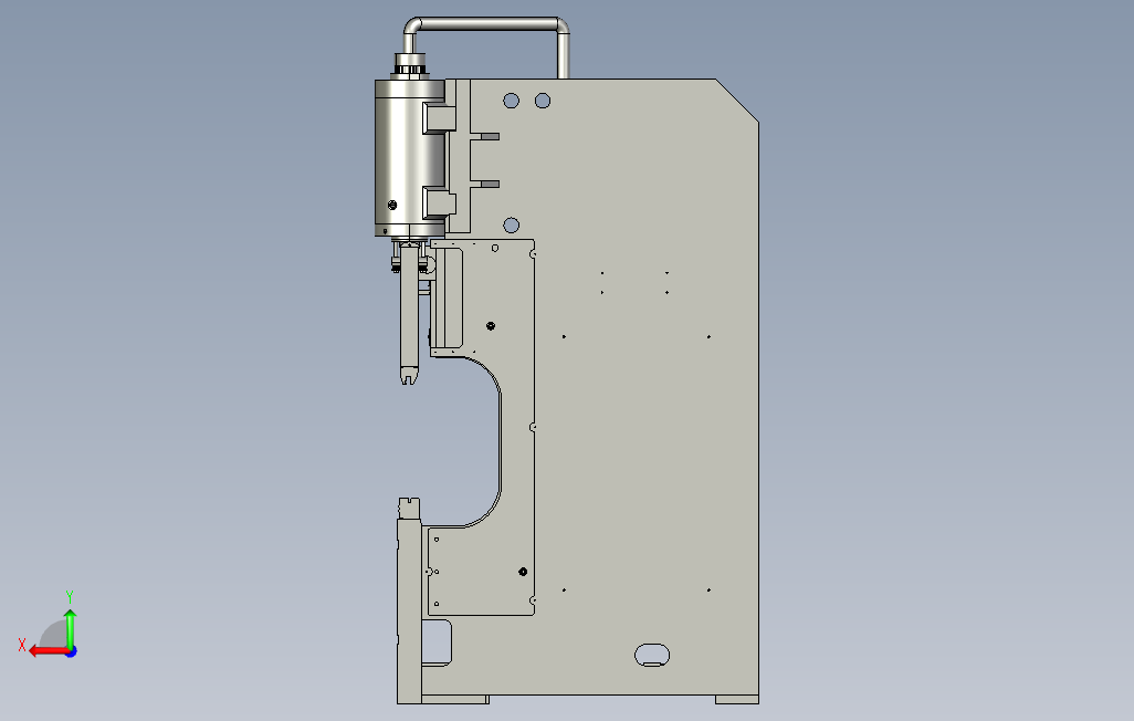 薄板折弯机模型图,是一种能够对薄板进行折弯的机器,其结构主要包括支架、工作台和夹紧板,工作台置于支架上,工作台由底座和压板构成,底座通过铰链与夹紧板相连,底座由座壳、线圈和盖板组成,线圈置于座壳的凹陷内,凹陷顶部覆有盖板。使用时由导线对线圈通电,通电后对压板产生引力,从而实现对压板和底座之间薄板的夹持。由于采用了电磁力夹持,使得压板可以做成多种工件要求,而且可对有侧壁的工件进行加工,操作上也十分简便。