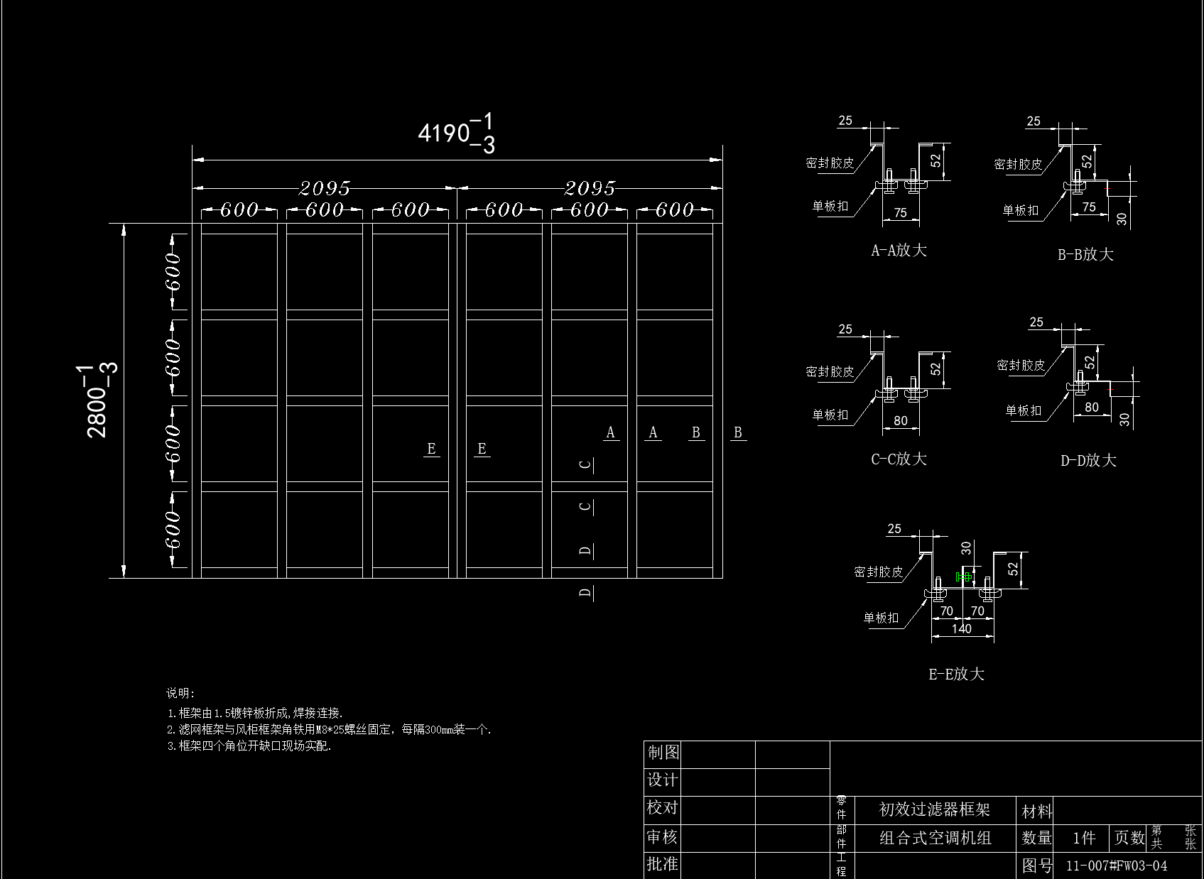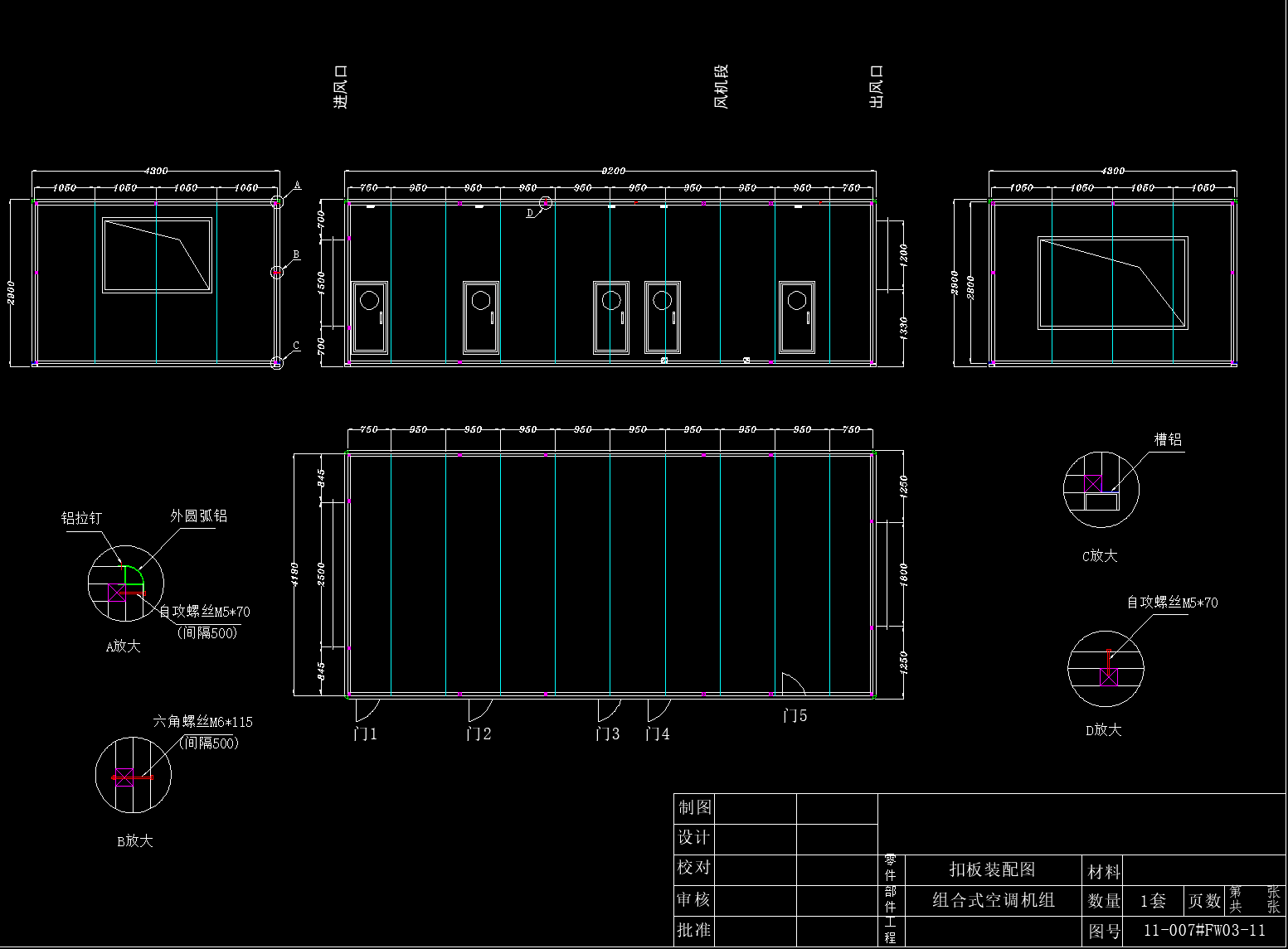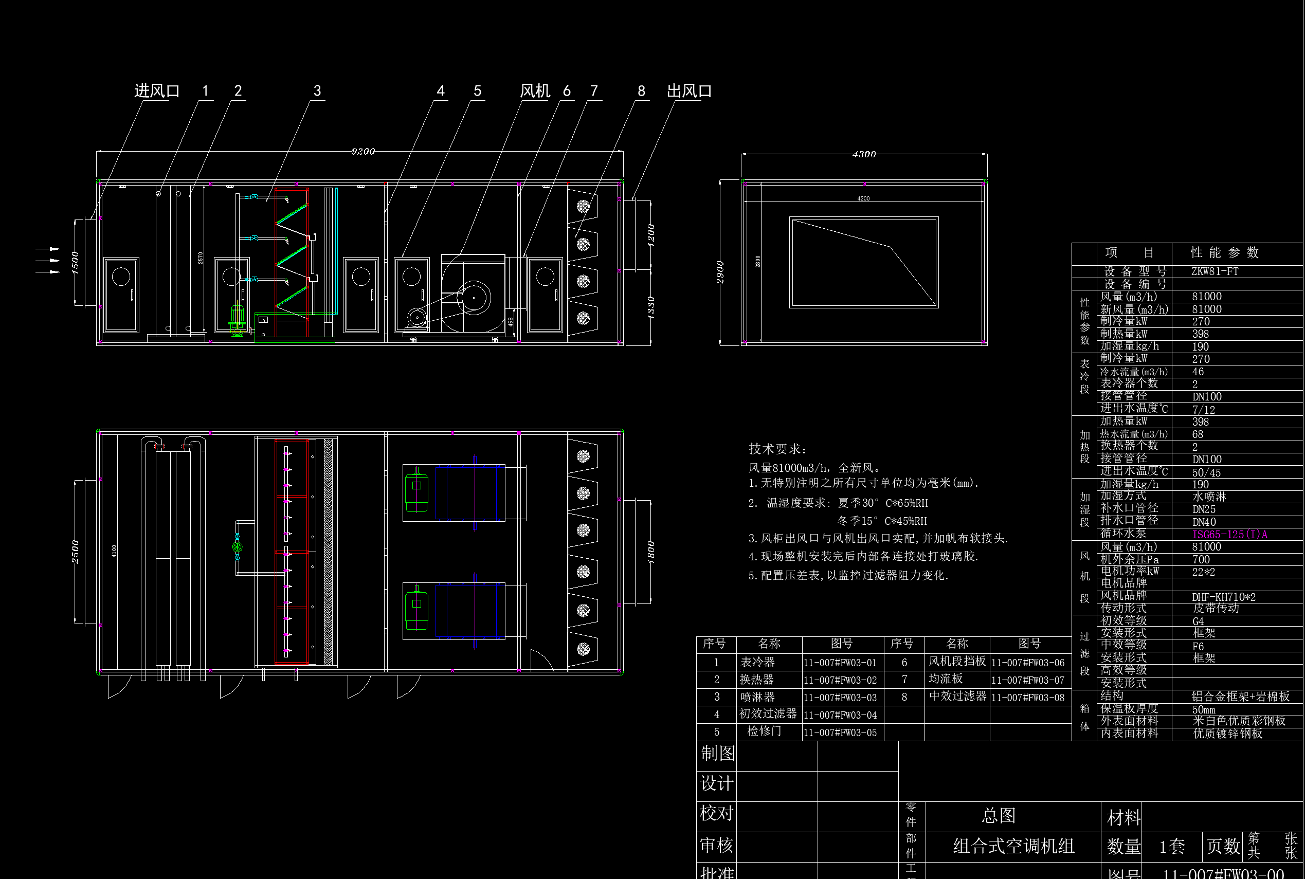 8.1万风量喷漆室送风空调机组详图,有详细设计参数 喷漆室送风空调是为确保漆膜质量、改进工作环境、削减损害工人安康及环境污染,喷漆房送风应契合涂装技术对空气洁净度、温度、湿度的需求。且喷漆房内的气流为均匀层流。为此,喷漆房应配空调送风体系及均压匀风仓。 空调送风体系由空调器、送风管路及装于管路上的电动多叶密闭阀组成。喷漆时,不一样段区间的变换靠电控管路上各有关电动多叶密闭阀主动敞开与封闭完成。手动多叶调风阀与电动多叶密闭阀宜成组安置,当风阻改变导致送排风量失调时,可及时调理送排风量使二者挨近持平。 空调器通常由进风段、粗滤段、中滤段、加热段、加湿段、风机段及若干中心段组成。