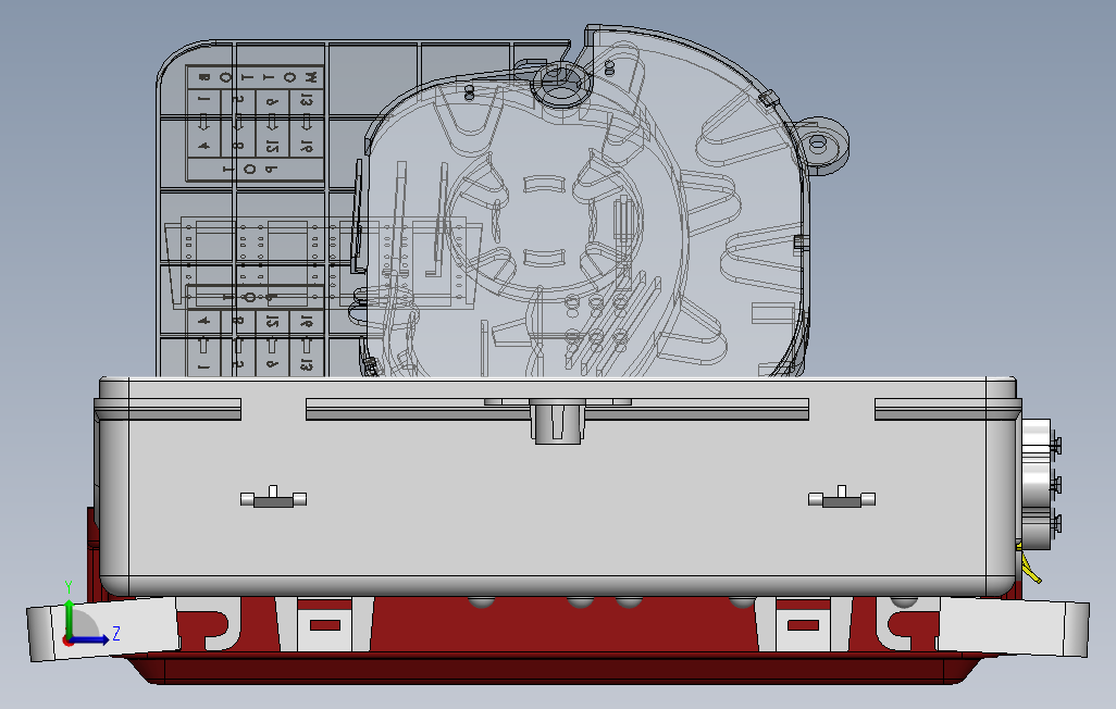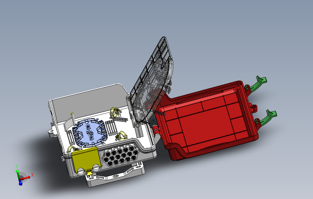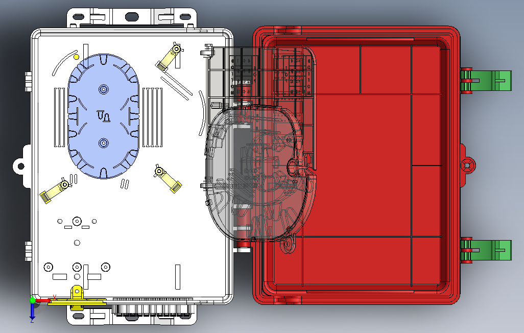 光纤托盘OTB模型图,由光电子器件、功能电路和光接口等组成,光电子器件包括发射和接收两部分。发射部分是:输入一定码率的电信号经内部的驱动芯片处理后驱动半导体激光器(LD)或发光二极管(LED)发射出相应速率的调制光信号,其内部带有光功率自动控制电路,使输出的光信号功率保持稳定。solidworks 2021 版本。欢迎朋友下载。