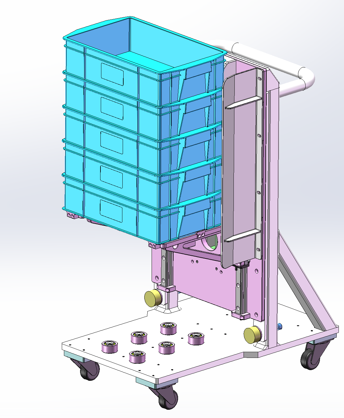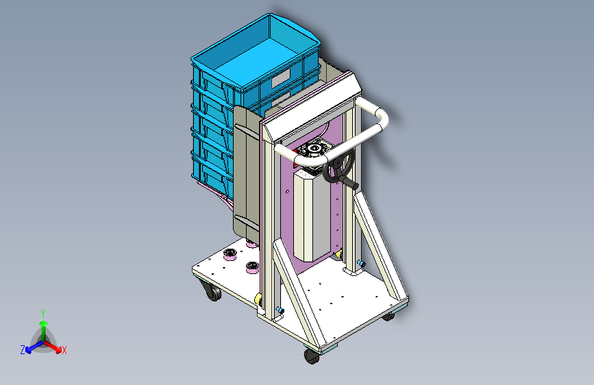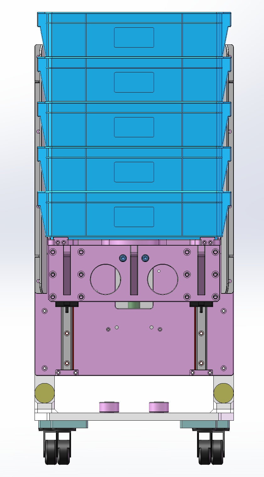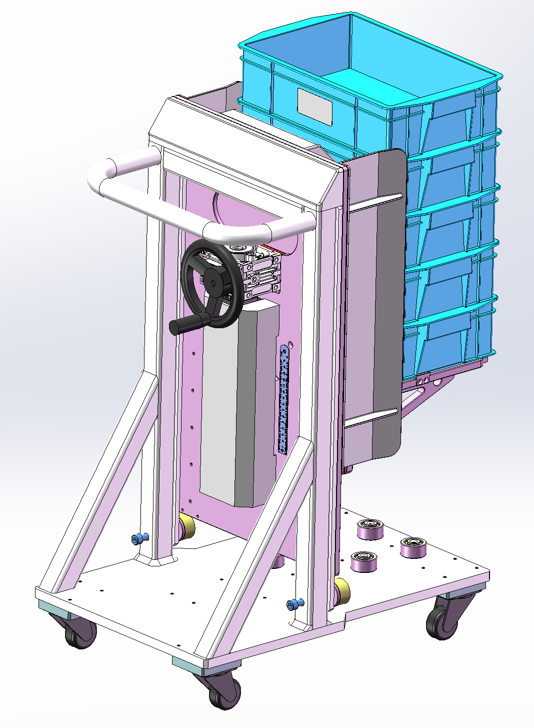 此附件为料箱转运小车三维,主要用于与自动化Tray上料对接工位,料箱堆叠摆放至可手动摇动升降的治具上,可用于料箱上下升降,底部为轮子,移动方便。欢迎下载交流学习