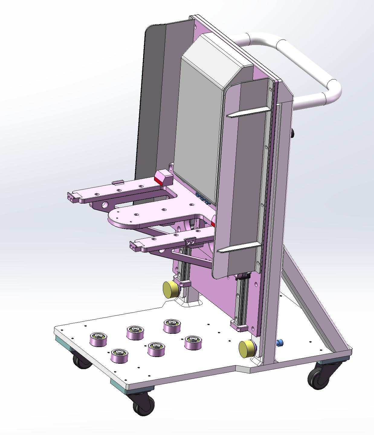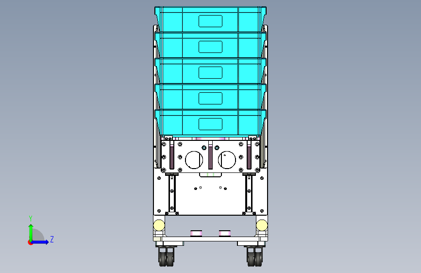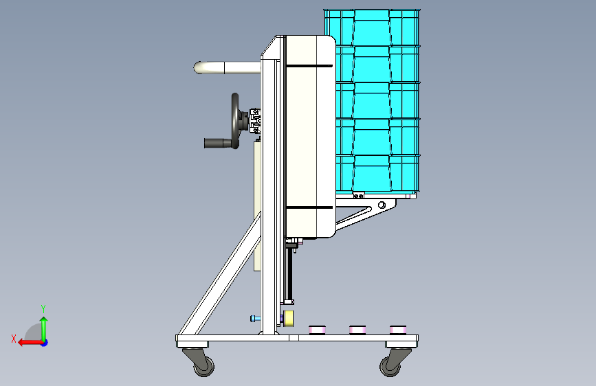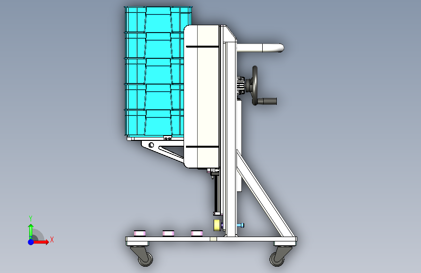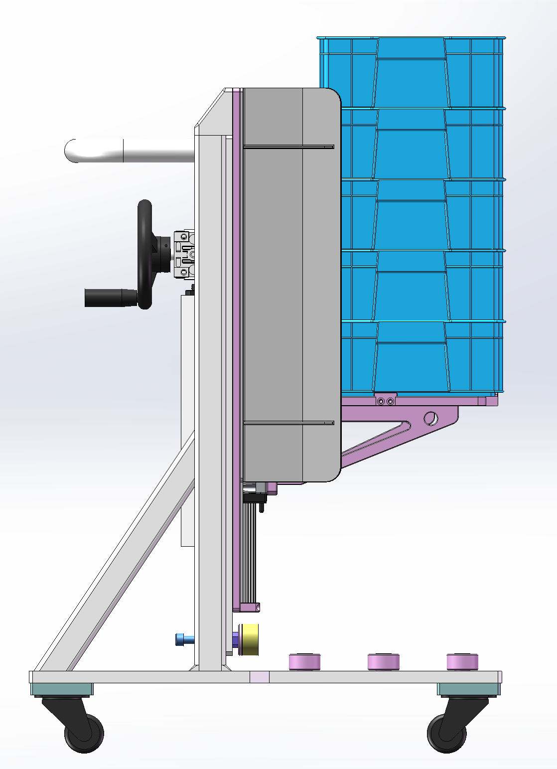 此附件为料箱转运小车三维,主要用于与自动化Tray上料对接工位,料箱堆叠摆放至可手动摇动升降的治具上,可用于料箱上下升降,底部为轮子,移动方便。欢迎下载交流学习