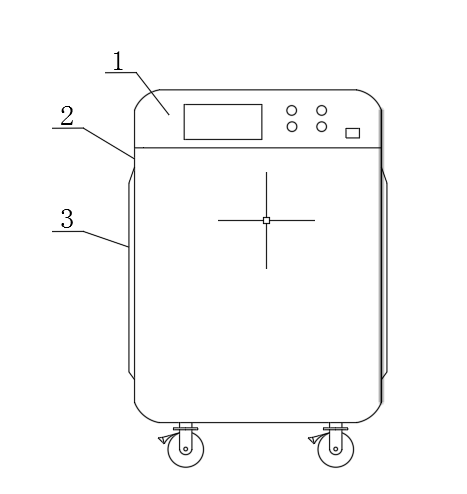 图中:1-触摸显示屏、2-空气净化器壳体、3-进风栅、4-气味传感器、5-初效过滤网、6-高效HEPA过滤网、7-光触媒活性炭滤网、8-吸风装置、9-陶瓷罩、10-出风栅、11-PM2.5传感器、12-粉尘传感器。