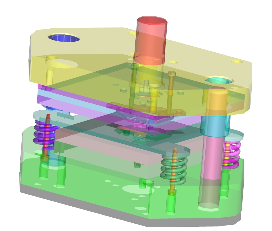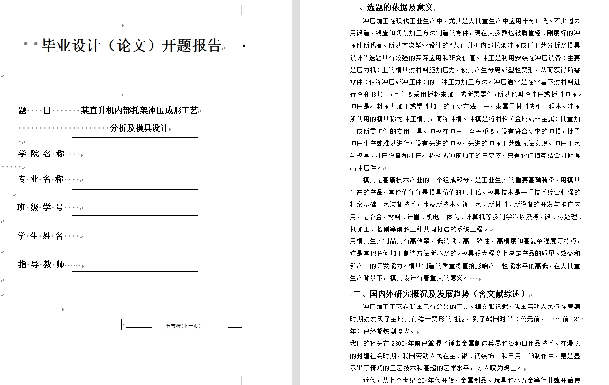 冲压加工在现代工业生产中,尤其是大批量生产中应用十分广泛。过去很多使用传统的工艺方法进行加工的工件,比如铸造、锻造和切削等加工方法制造的零件,现在大部分也被刚度好、质量轻的冲压零件所代替。所以本次毕业设计的“某直升机内部托架冲压成形工艺分析及模具设计”选题具有较强的实际应用和研究价值。冲压顾名思义是通过压力让模具使材料进行塑性变型从而得到所需求零件的一种加工方法,压力的来源于压力机。冲压通常是在常温下对材料进行冷变形加工,而且大部分采用板料来加工成所需零件,所以也叫冷冲压或板料冲压。冲压是材料压力加工或塑性加工的主要方法之一,隶属于材料成型工程术。冲压所使用的模具称为冲压模具,简称冲模。冲压模