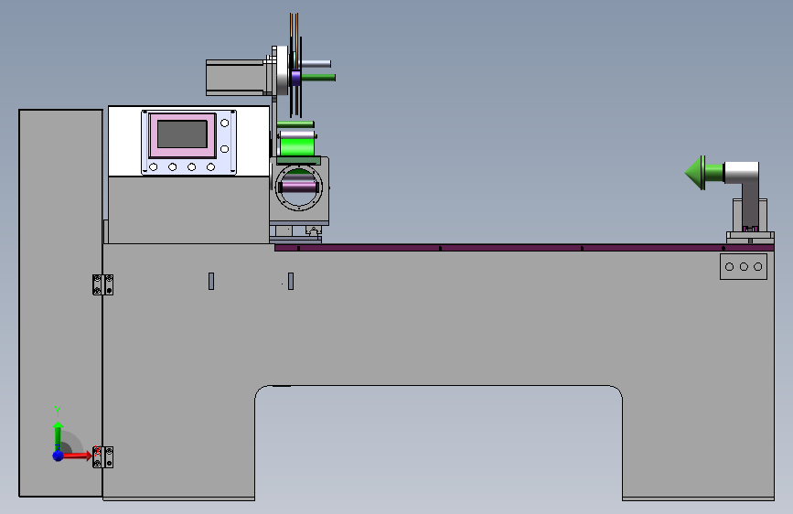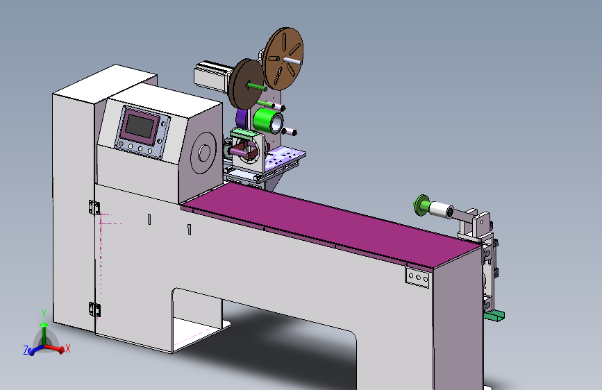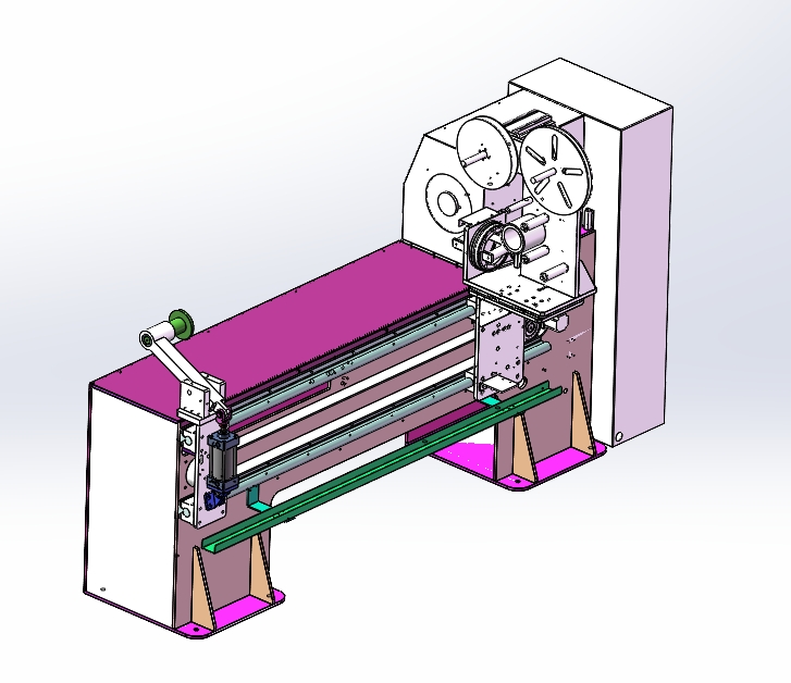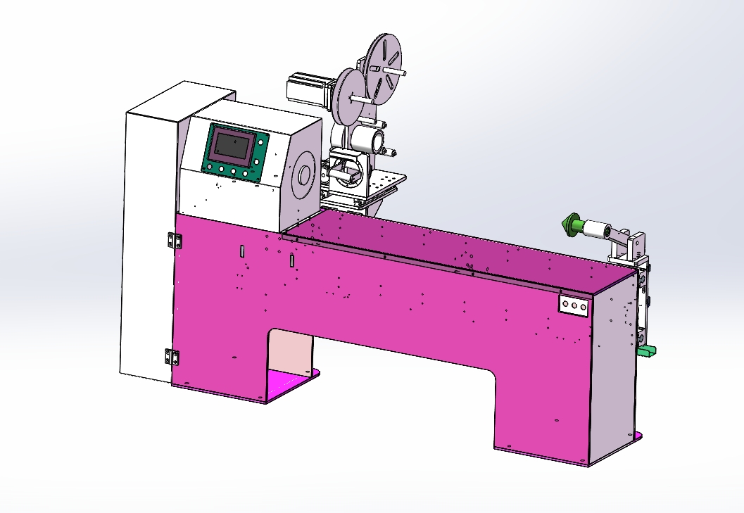 功能达成目标: 导入产品信息后保存, 设备随胶管的波 纹角度来摆动弧度自动缠绕定型。 操作方法: 人工将胶管套入模具并固定好, 布带在胶管上 固定好以免松动滑脱, 触摸屏设定好产品参数, 按开始后 自动缠绕布带排气定形完, 自动回收布带, 再次循环工作; 产品范围: 适用模具长度 1 100mm以内 电源: 三相四线380V 50Hz/60Hz 气源: 0. 4~0. 8Mpa 压缩空气 设备规格: 约长2300*宽600*高1200mm以实际测量为准)
