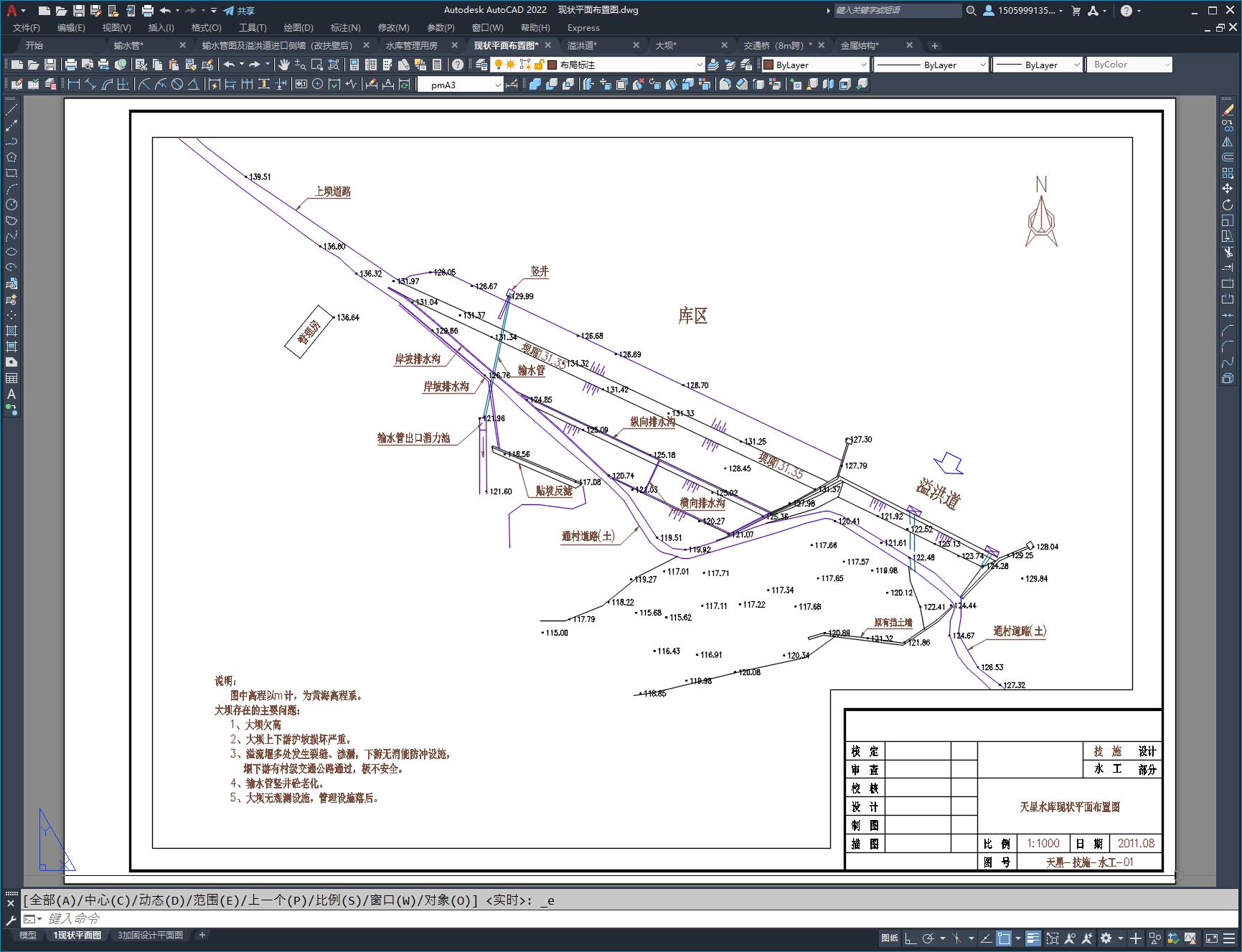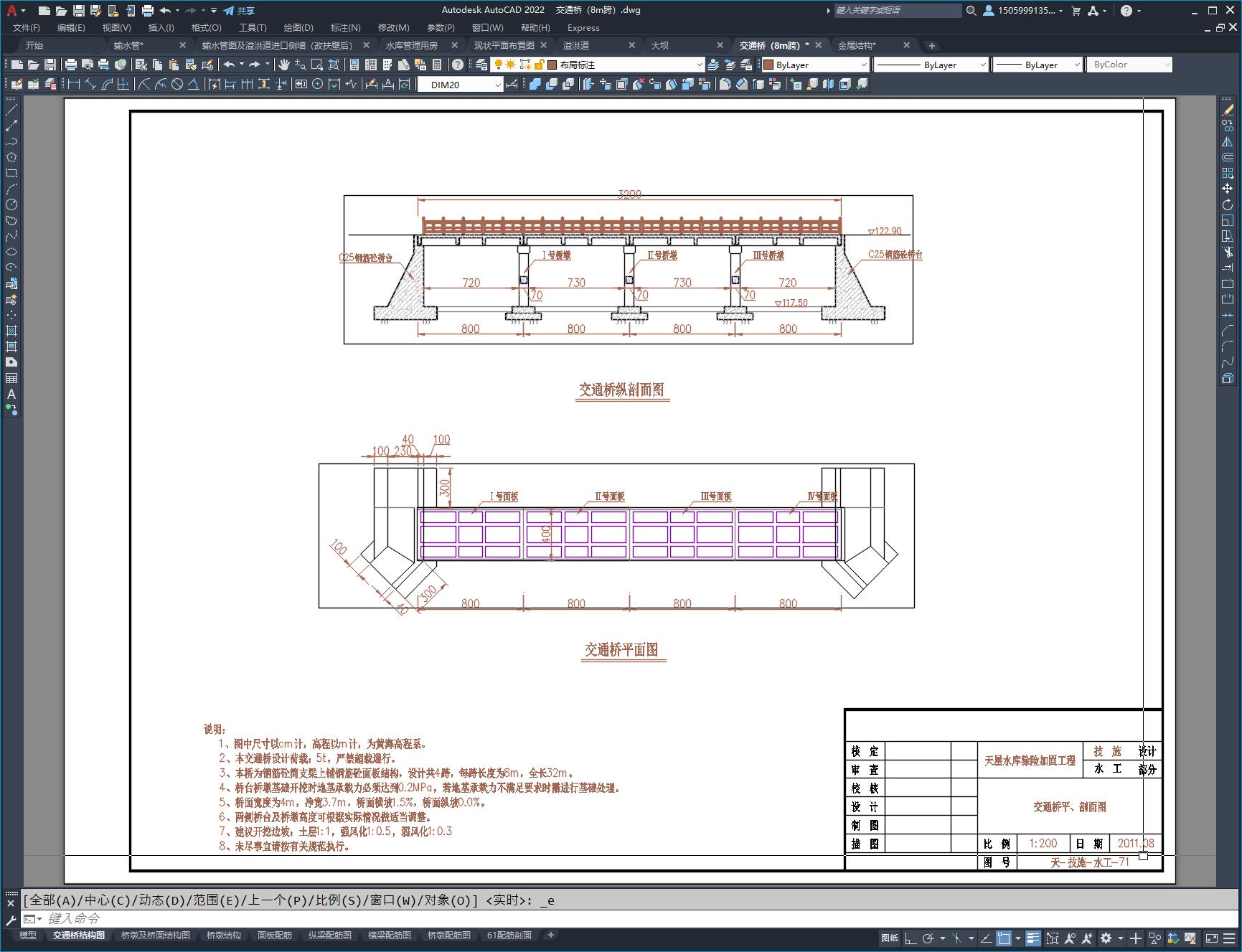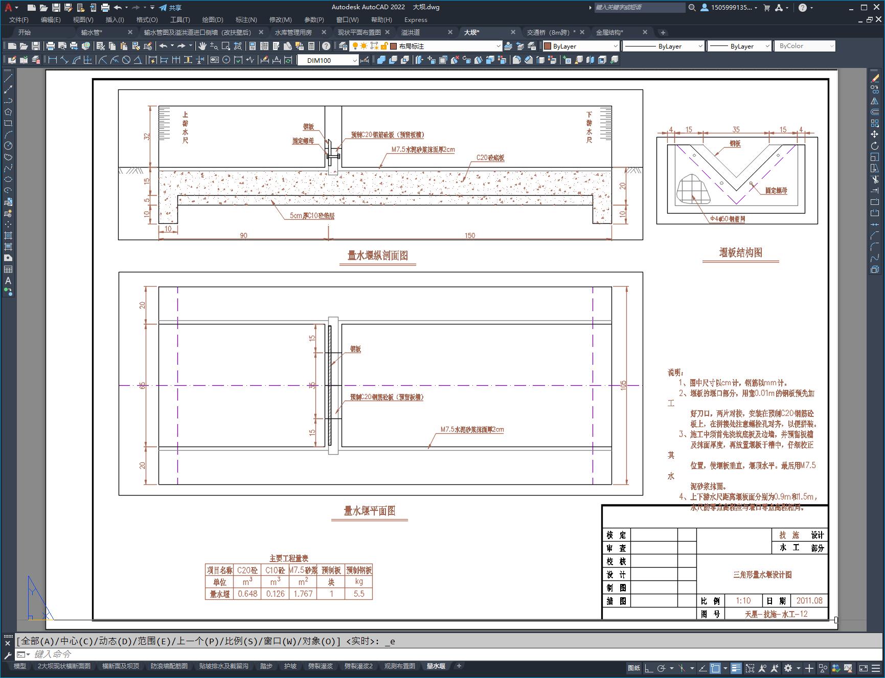 图纸包含:溢洪道(WES堰流),8米跨溢洪道交通桥,大坝,输水管(竖井式)。