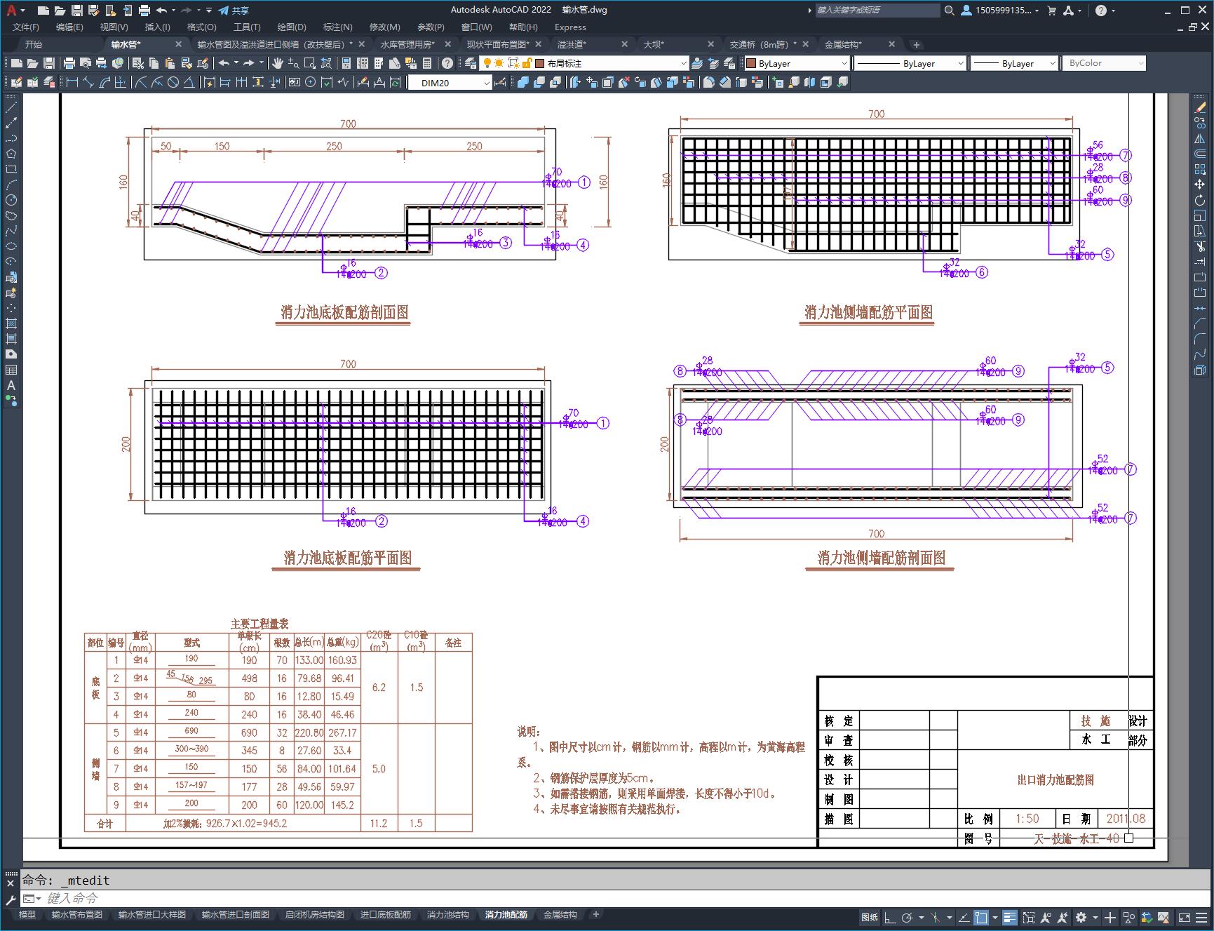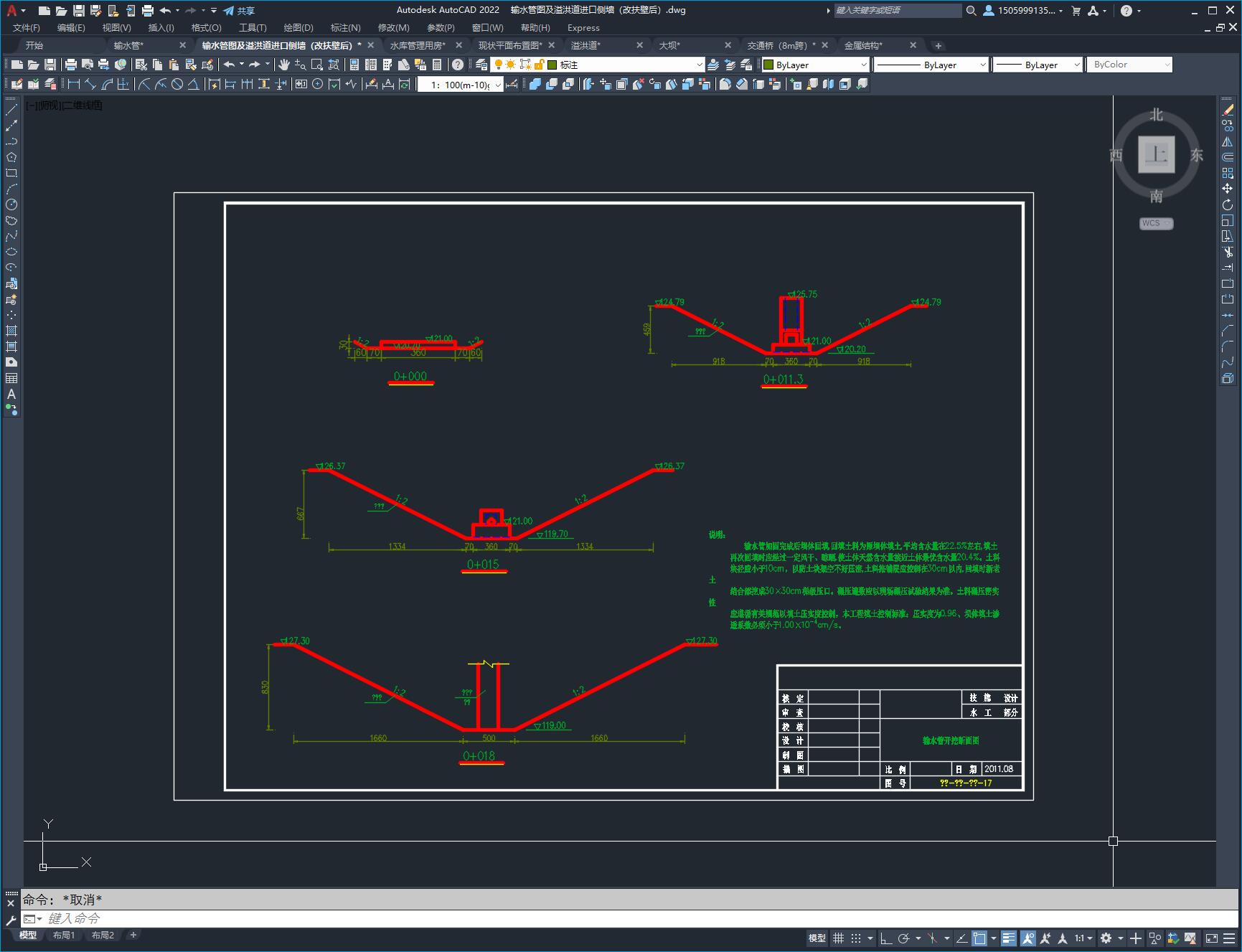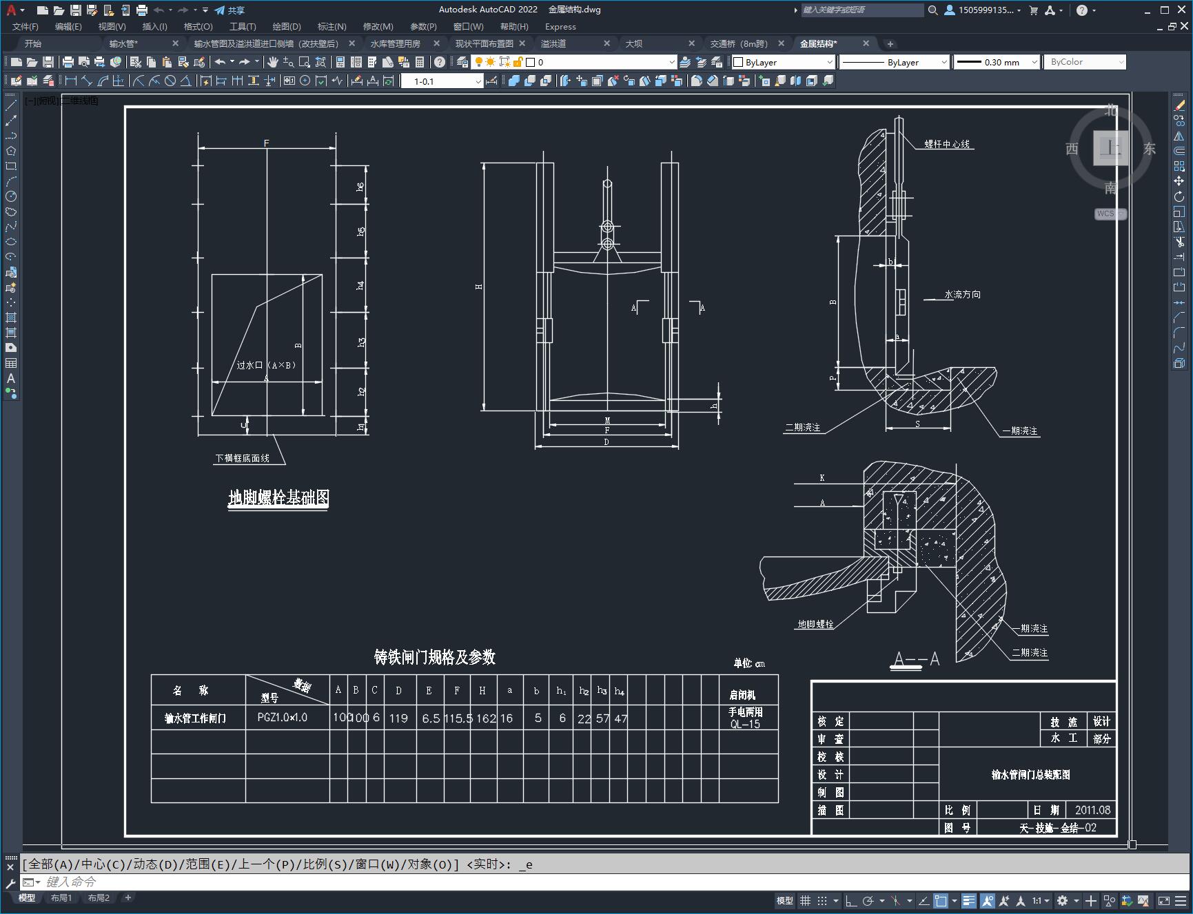 图纸包含:溢洪道(WES堰流),8米跨溢洪道交通桥,大坝,输水管(竖井式)。