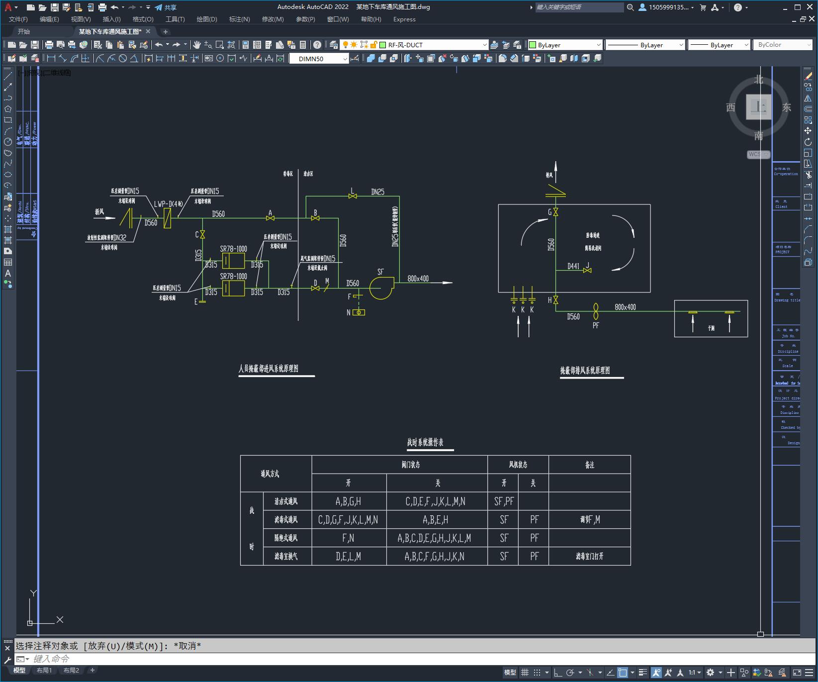 本设计为平战结合设计。平时为地下车库,战时分为四个单元,其中三个为6级二等人员掩蔽部,掩蔽人数分别为1170人, 1230人和1090人;一个为6级移动柴油电站。地下车库分为三个防火分区,采用机械进风,机械排风的通风方式。