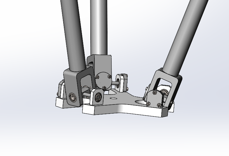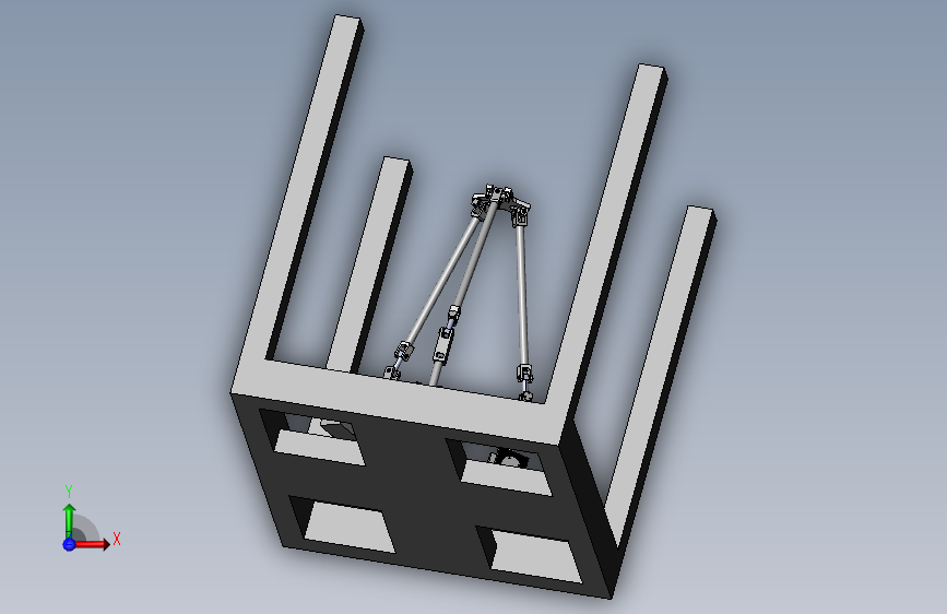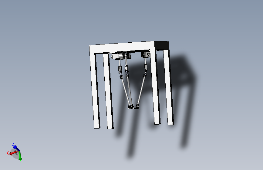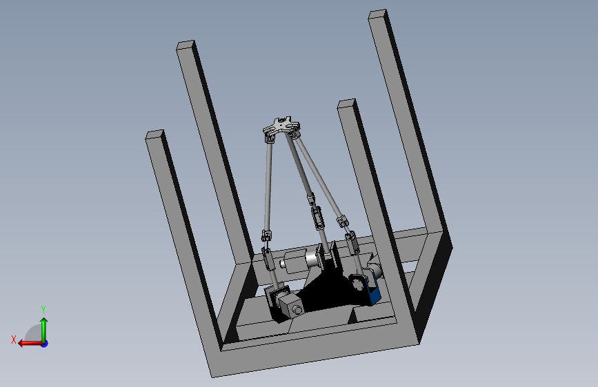 并联机械手,模型为一款带框架并联机械手模型,模型为sw绘制,模型主要由框架,底板,电机,顶板,关节轴,减速器,中间关节,轴承端盖,主动臂杆,主动臂头,转动关节等装配组成。