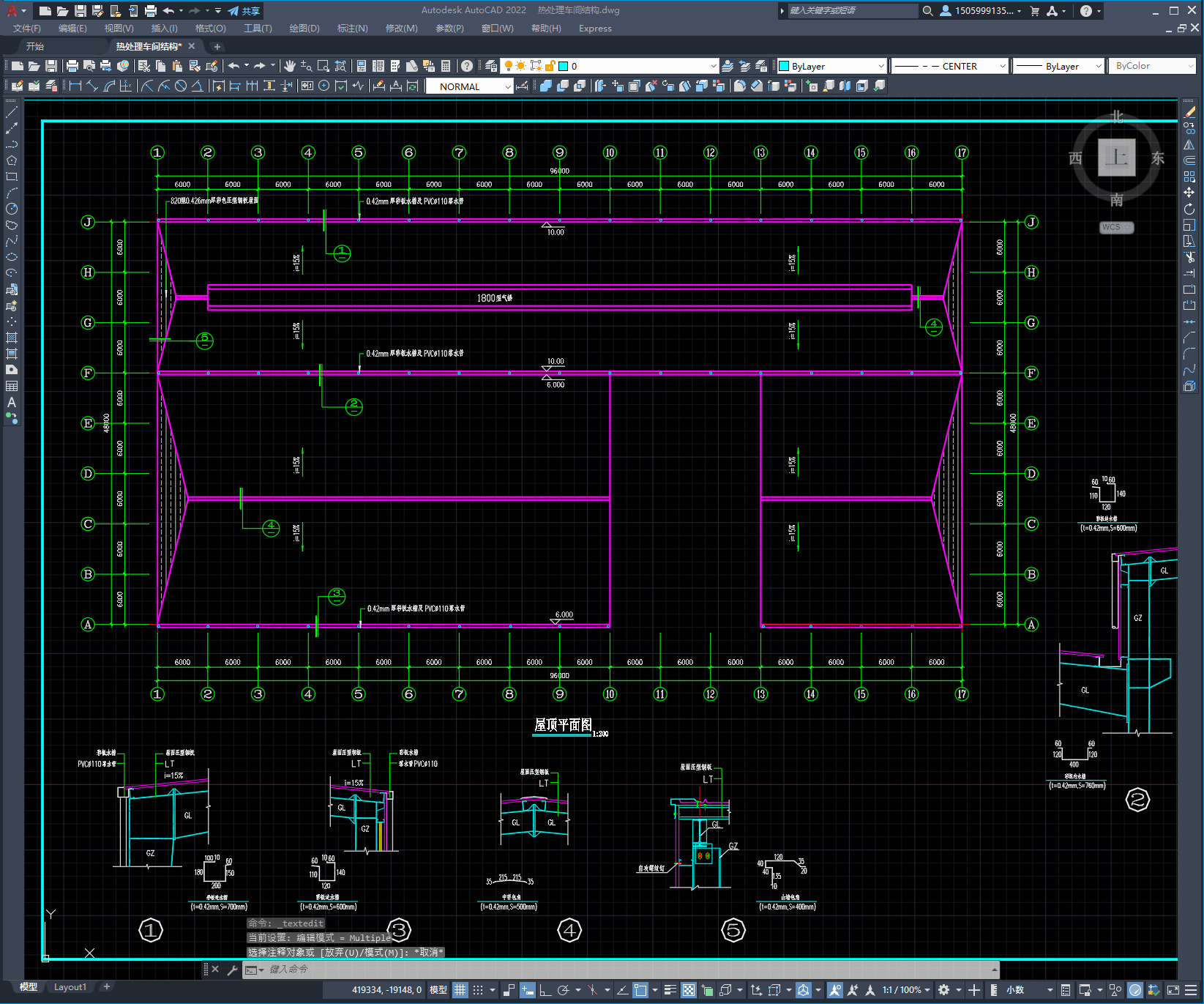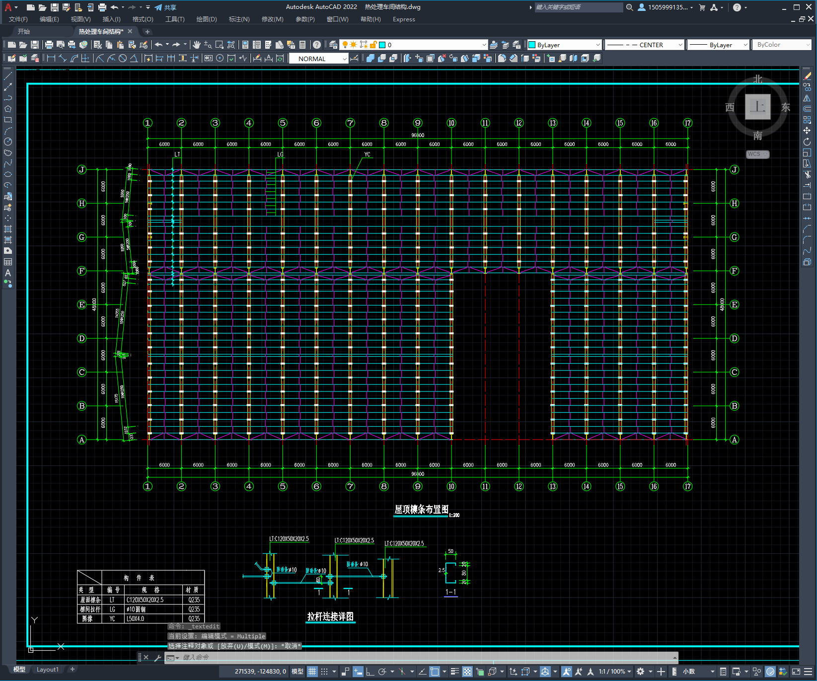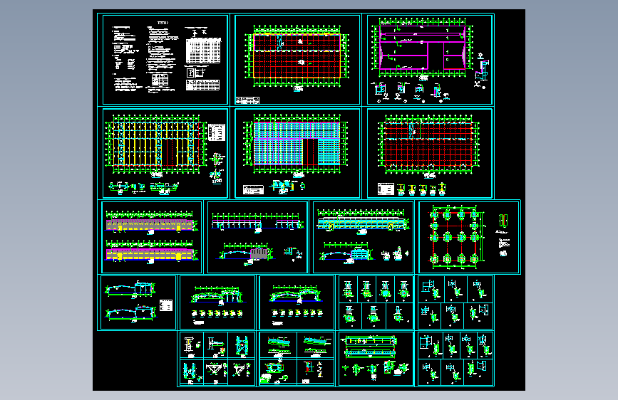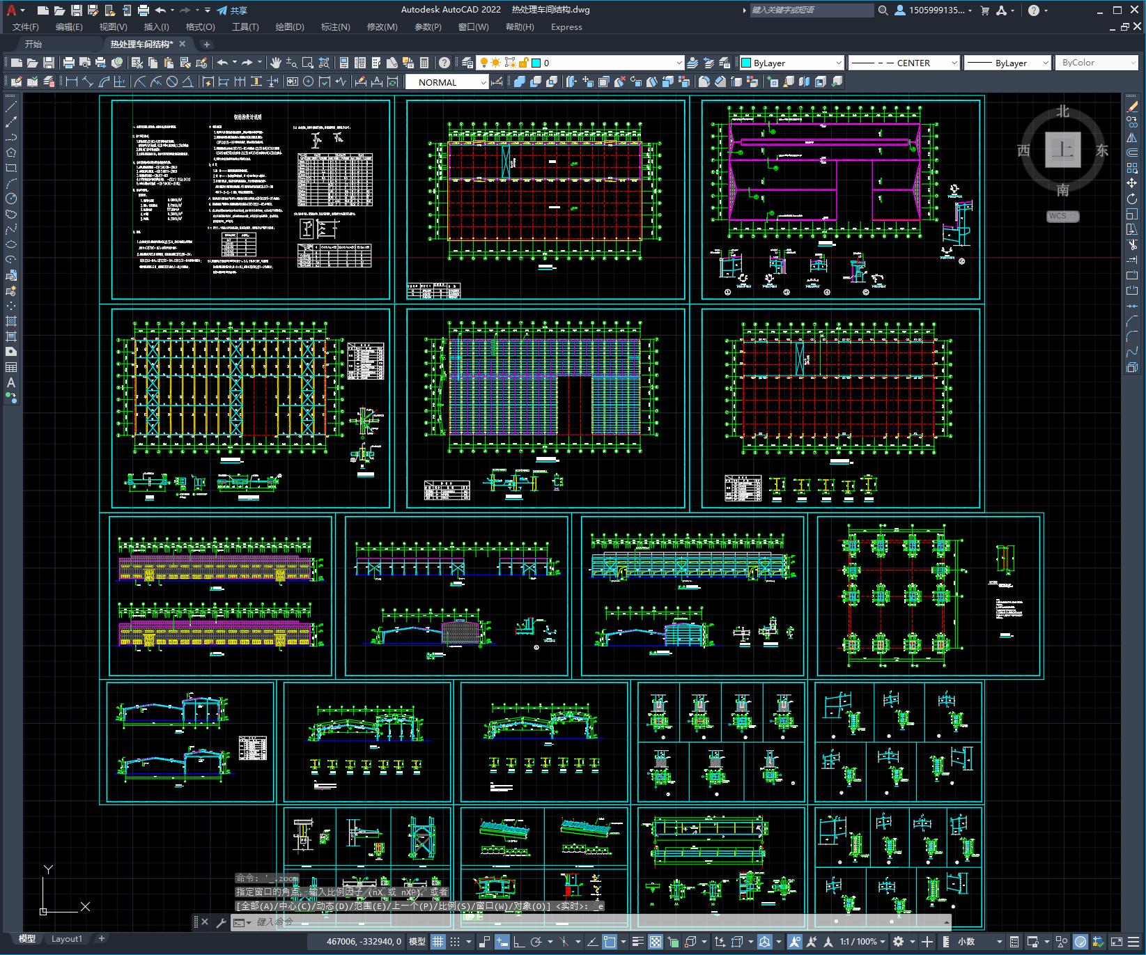 热处理车间结构,采用不等高双跨门式钢架。图纸19张,包括::钢结构设计说明、基础布置图、锚栓布置图、屋面檩条布置图、屋面支撑布置图、柱间支撑布置图、墙面檩条布置图、钢架详图及构件详图等。