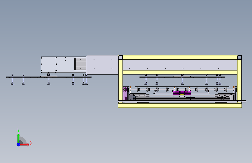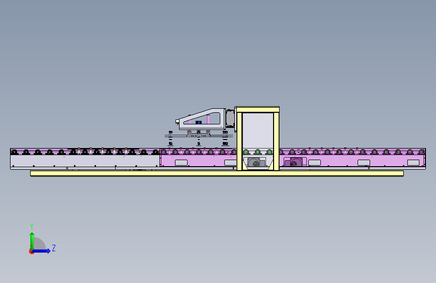 液晶面板由变频电机驱动滚轮组件进行输送,在此过程中由双向模组定中装置对其进行定中,再由定位组件将其定位,最后由机械手进行抓取移栽至下一工位。面板尺寸1058x603。