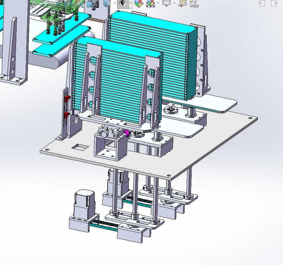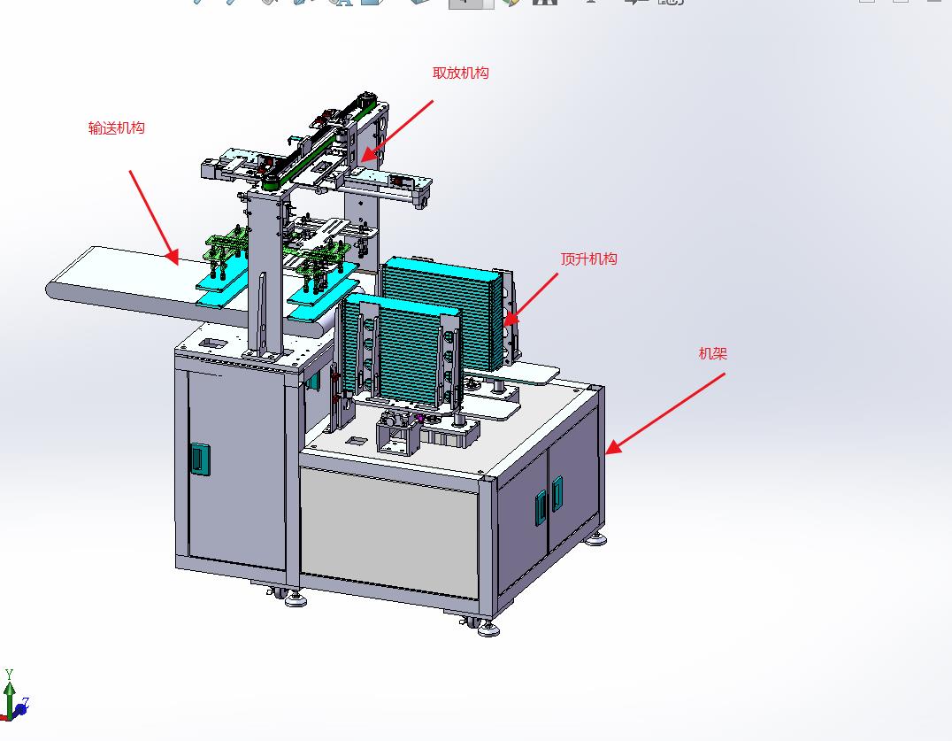 由可调宽度、定位机构进行垫板定位,由两侧电机+丝杠组件实现递进式提升以便于抓取。再由取放机构进行抓取后,并由旋转气缸及二次伸进结构实现双位置放料功能。