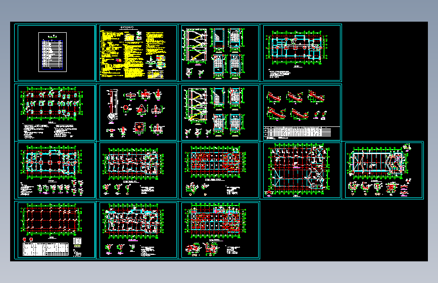 图纸包括:结构设计总说明,基础平面布置图,基础详图,基础梁平面布置图,室内地沟布置图,柱平面布置图,柱详图,4.100 梁配筋图,4.100 板模板及板配筋图,7.100–、10.100 梁配筋图,7.100–、10.100 板模板及板配筋图,屋面梁配筋图、屋面梁标高图,屋面板模板及板配筋图,楼梯详图