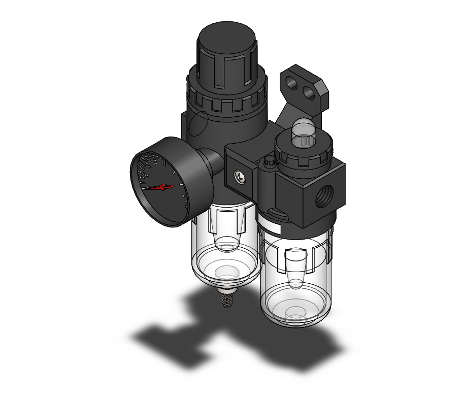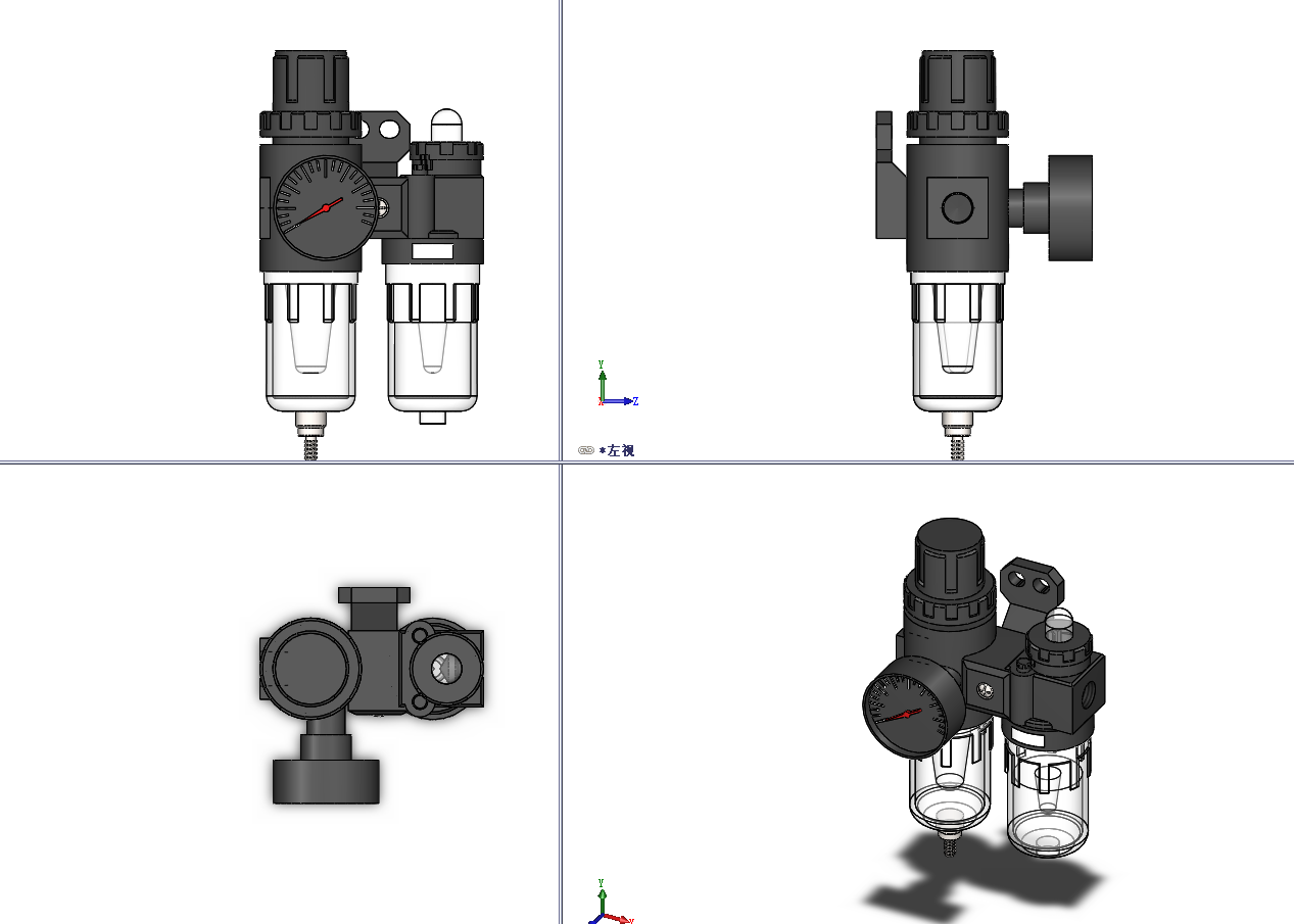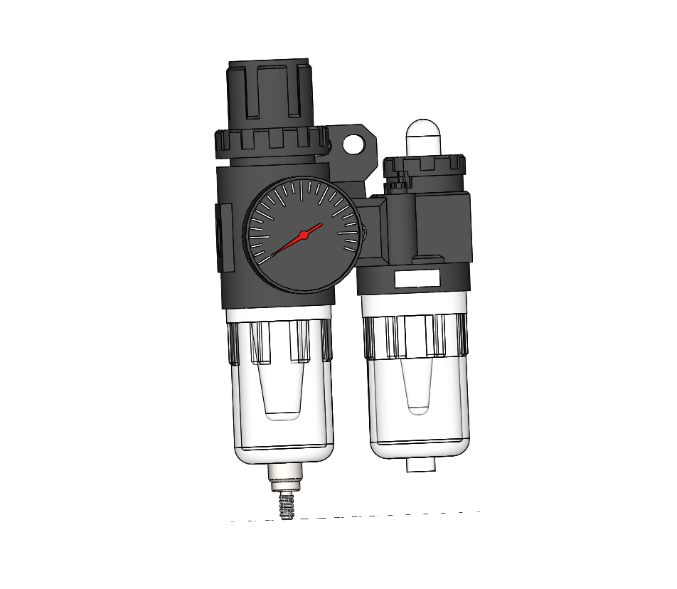 2款AFC系列空气过滤组合(二联件)模型 , 气源处理三联件包括空气减压阀、过滤器、油雾器三大件,减压阀可对气源进行稳压,使气源处于恒定状态,可减小因气源气压突变时对阀门或执行器等硬件的损伤。