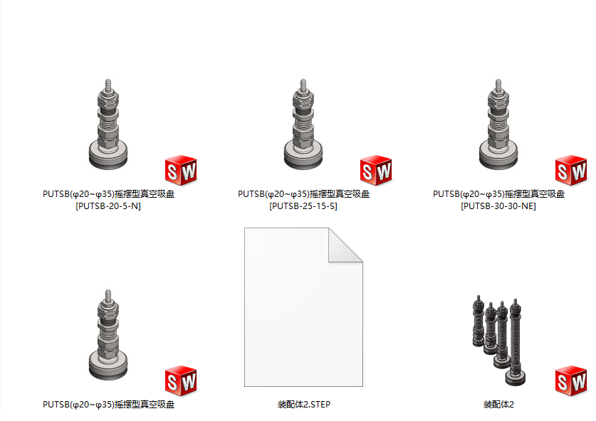 4款PUTSB(φ20~φ35)摇摆型真空吸盘模型 ,吸盘材质有,丁氰橡胶,硅胶,导电硅胶等 ,模型包含stp格式,欢迎大家参考下载学习