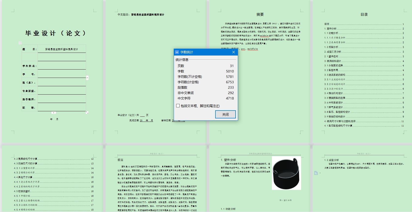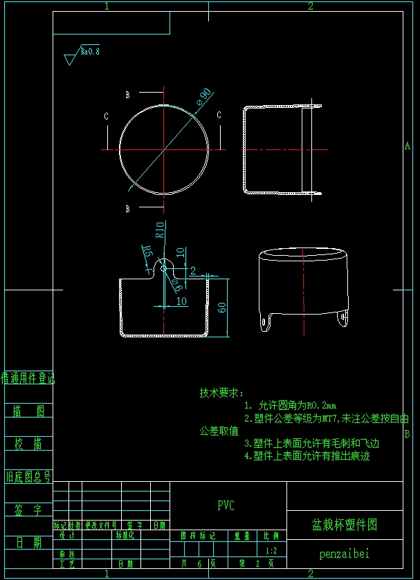 本课题主要是针对盆栽杯的注塑模具设计,聚氯乙烯(PVC)。通过对塑件进行工艺的分析和比较,最终设计出一副注塑模。该课题从产品结构工艺性,具体模具结构出发,对模具的浇注系统、模具成型部分的结构、侧抽机构、顶出系统、冷却系统、注塑机的选择及有关参数的校核都有详细的设计,同时用moldfolw进行了模流分析,节省了模具设计的时间及开模成本。根据题目设计的主要任务是盆栽杯注塑模具的设计,也就是设计一副注塑模具来生产塑件产品,以实现自动化提高产量。