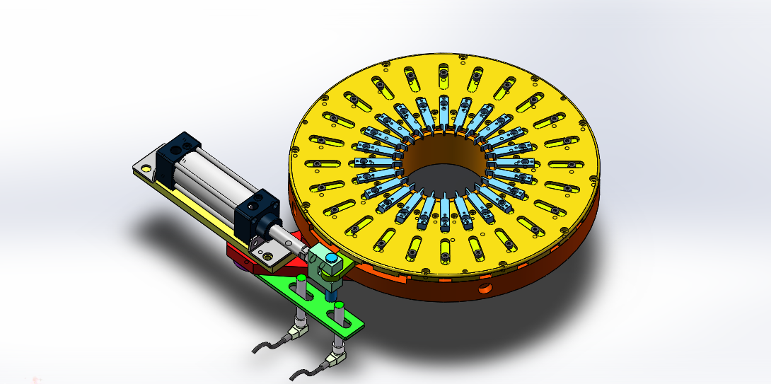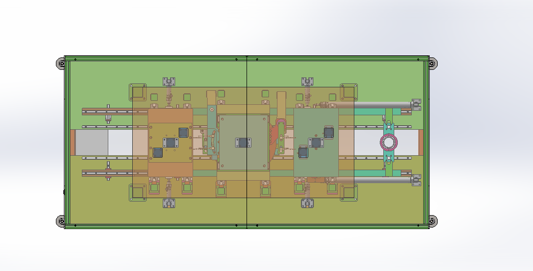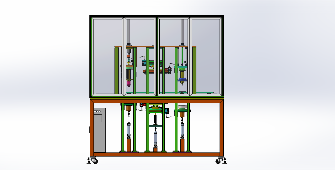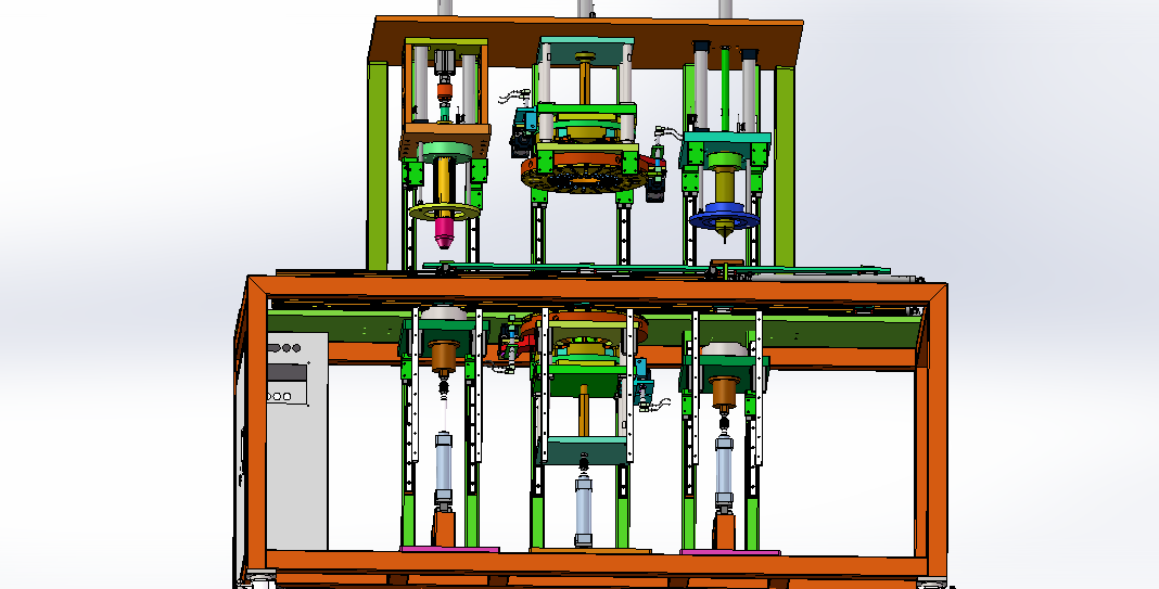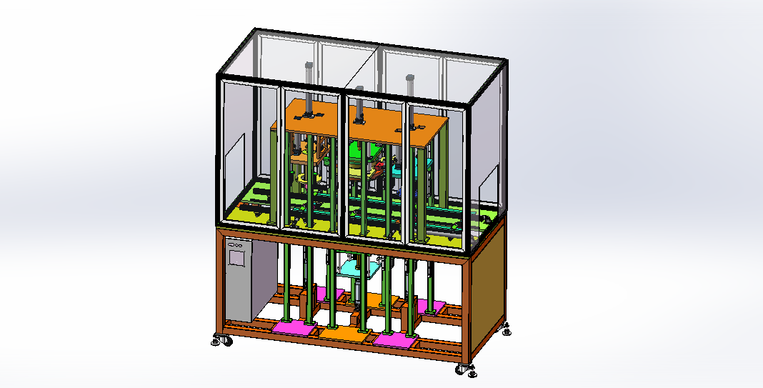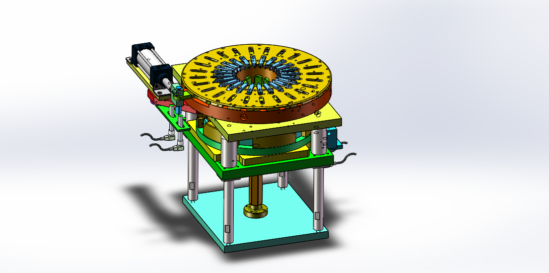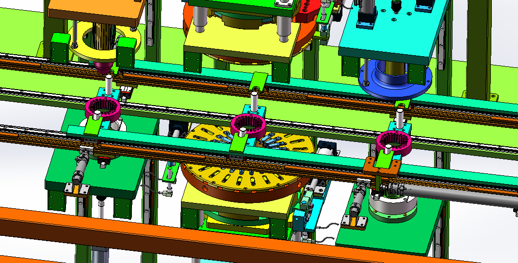 四工位电机定子绕线槽加工打点设备 设计思路:定子绕线槽的加工设备,需要加工定子绕线槽口和打点,设备一共是有四个工位,四个工位之间物料传送是使用自动流水线模式,安装定子夹具精准定位。第一工位是人工上料工位,自动感应物料;第二工位是冲切两边的短槽口;第三工位是定位外边缘自动打点;第四工位是冲切另外两边的长槽口。 四工位电机定子绕线槽加工打点设备结构介绍:设备防护罩、自动流水线机构、冲切槽口上下模机构、自动打点上下模机构和电气配件构成,各组件结构具体构造如下: 1,自动流水线机构:由导轨滑块、定子定位工装、气缸直线运动模组和气缸升降运动模组组成; 2,冲切槽口上下模机构:由切槽上模、切槽下模和气动升
