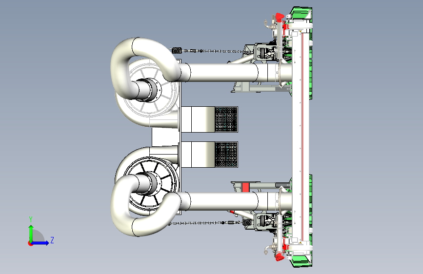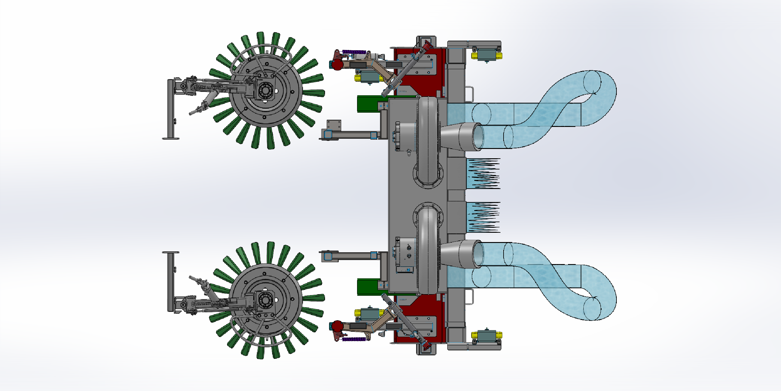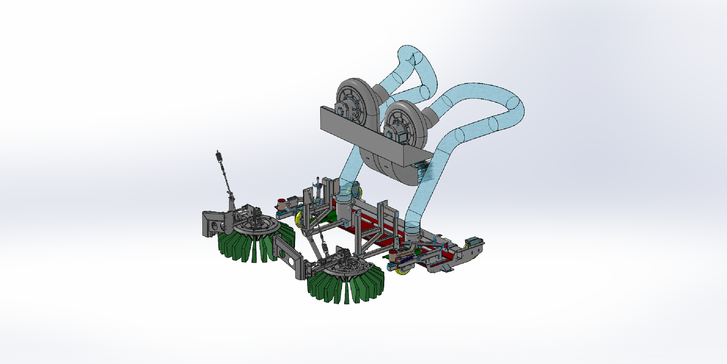 这款洗扫车的双风机结构。上方并排的两个风机,是这套结构的核心。风机通过管道连接下方清扫装置,管道呈弯曲状,负责输送气流。底部两侧的绿色旋转刷盘,在作业时负责清扫垃圾。整套结构协同运作,风机产生强劲吸力,配合刷盘清扫,将路面垃圾、灰尘吸入收集,高效完成洗扫车的清洁任务,是保障路面洁净的关键配置。