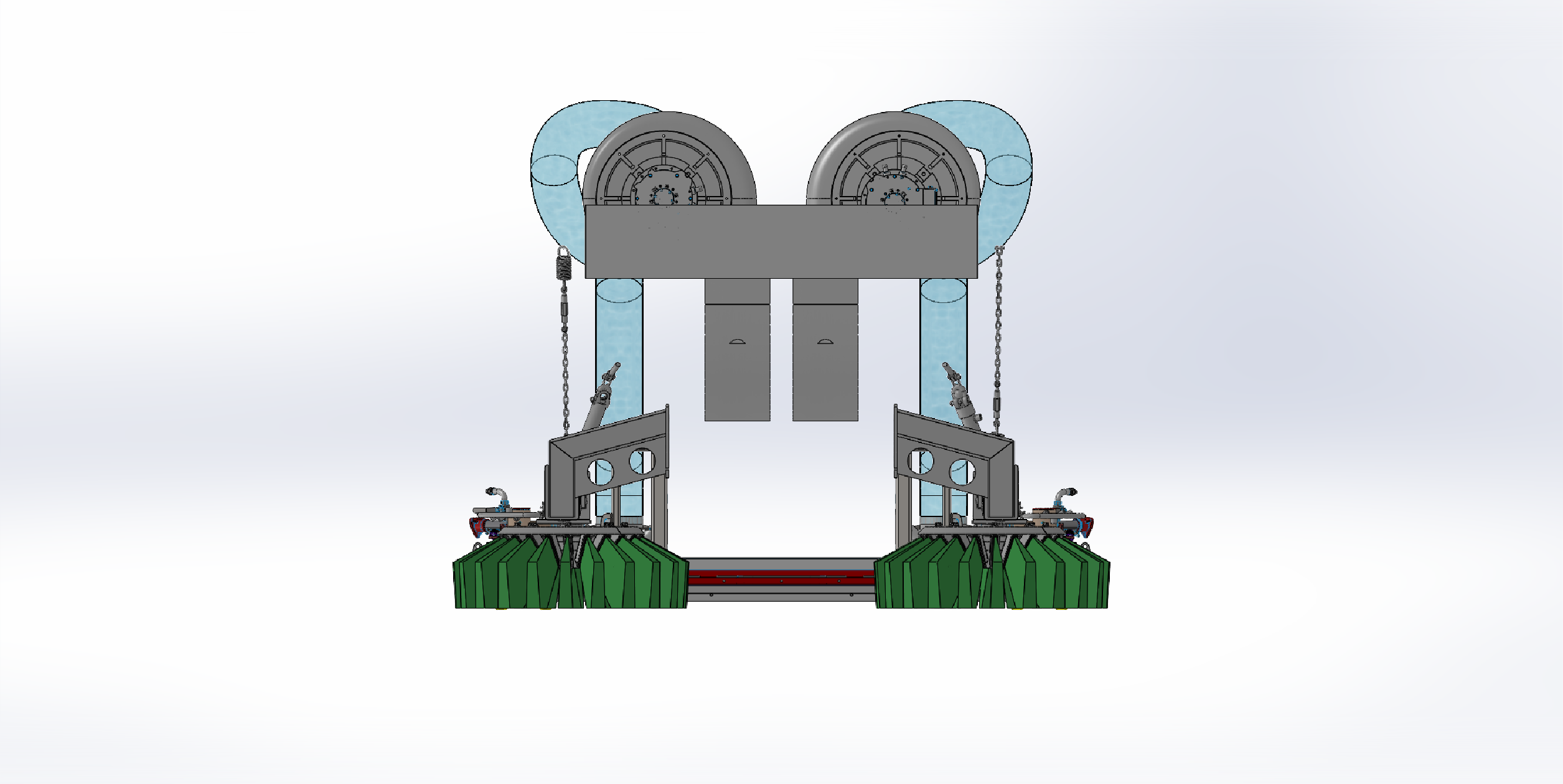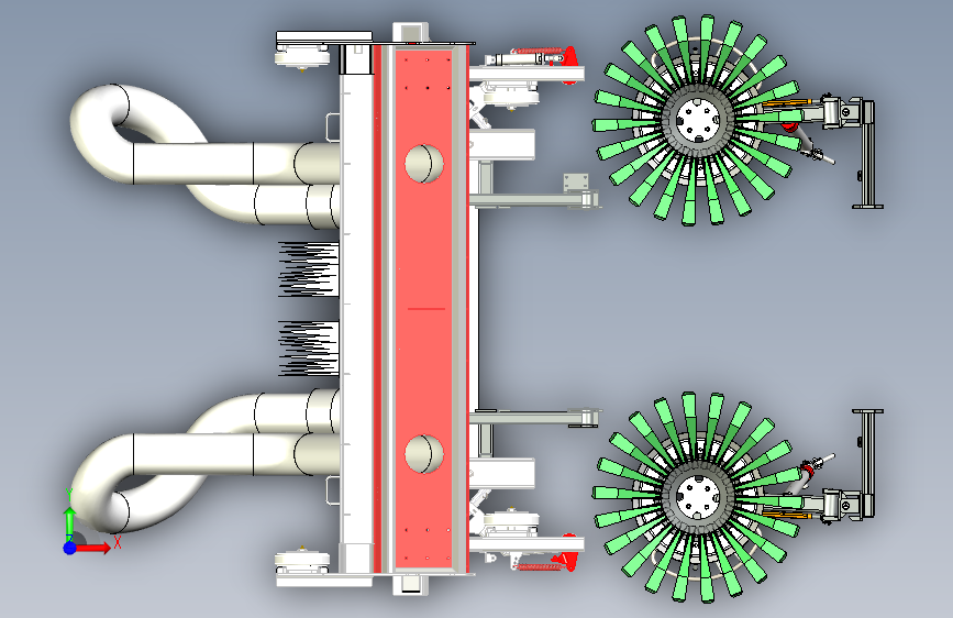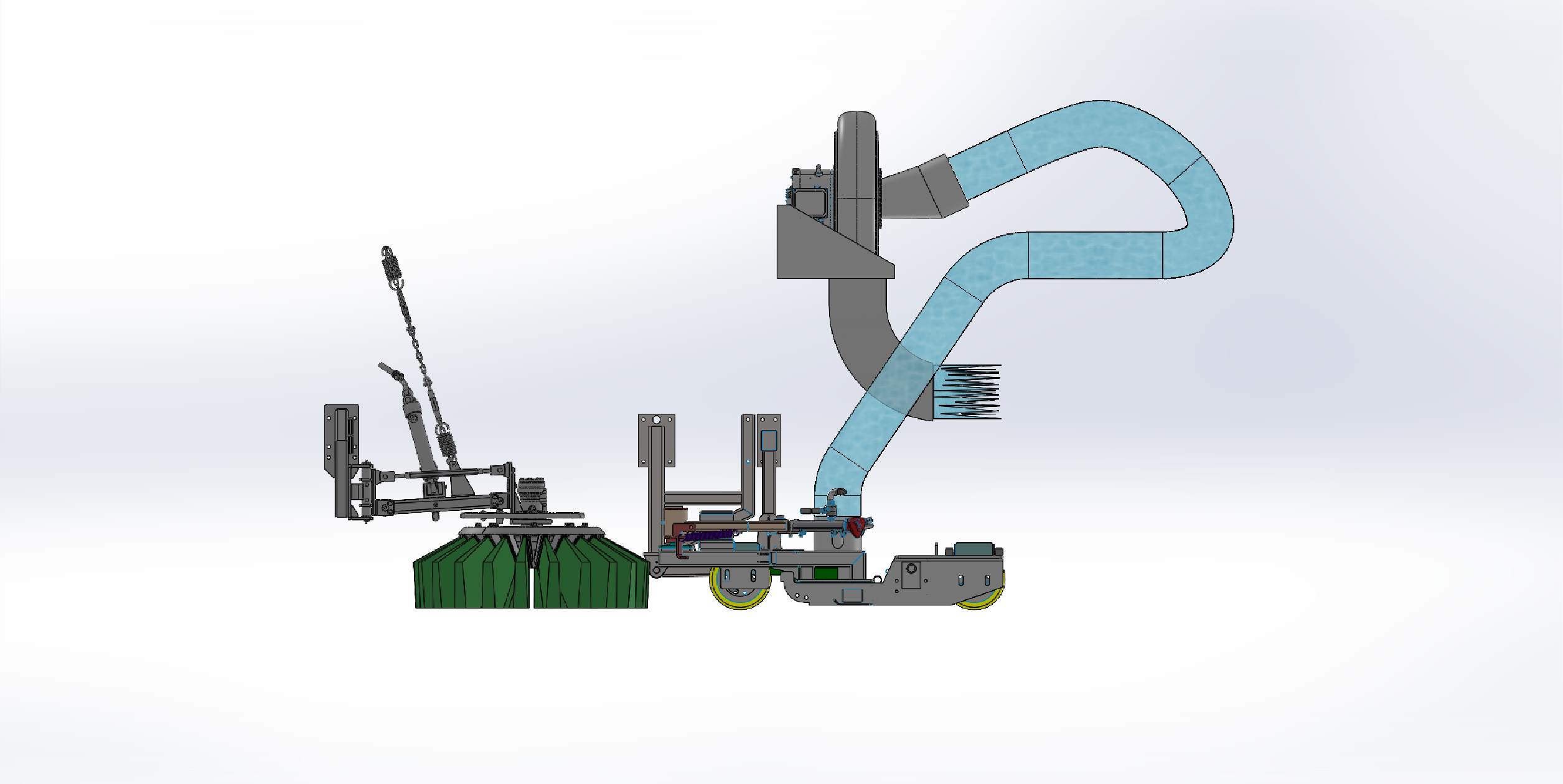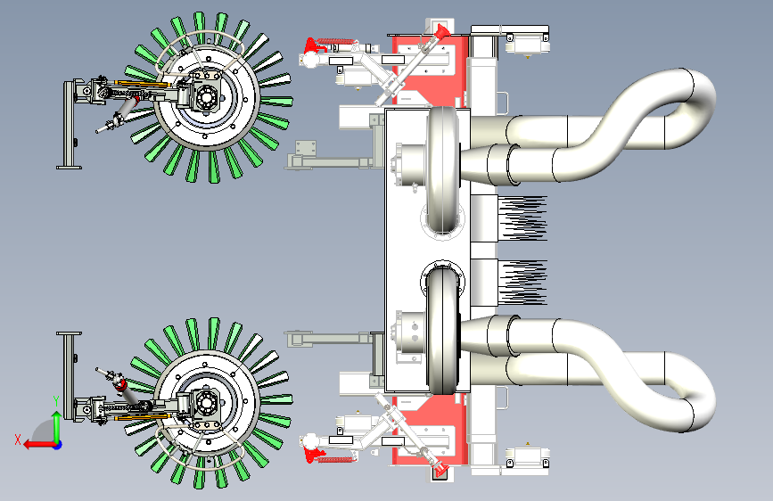 这款洗扫车的双风机结构。上方并排的两个风机,是这套结构的核心。风机通过管道连接下方清扫装置,管道呈弯曲状,负责输送气流。底部两侧的绿色旋转刷盘,在作业时负责清扫垃圾。整套结构协同运作,风机产生强劲吸力,配合刷盘清扫,将路面垃圾、灰尘吸入收集,高效完成洗扫车的清洁任务,是保障路面洁净的关键配置。