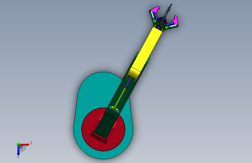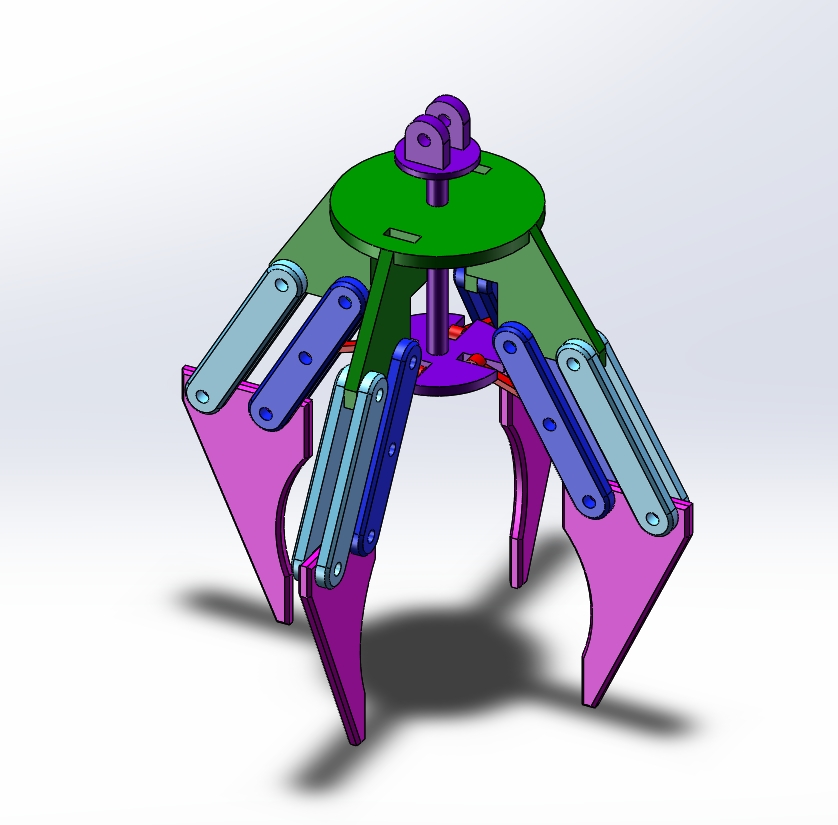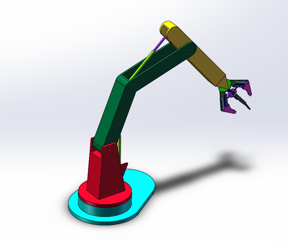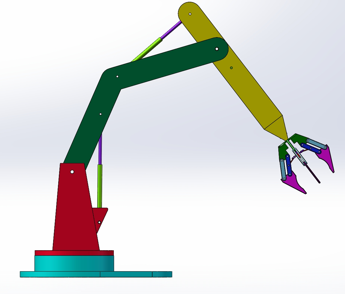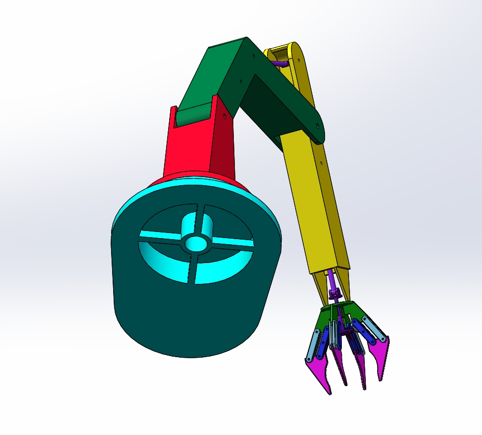 这是气动(或液压)驱动的多关节机械臂,基于 SolidWorks 建模,用于模拟自动化抓取作业
