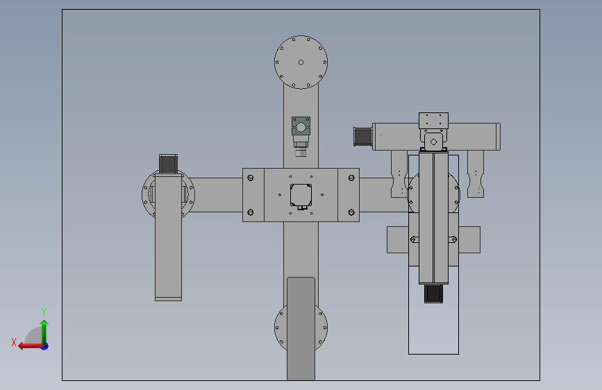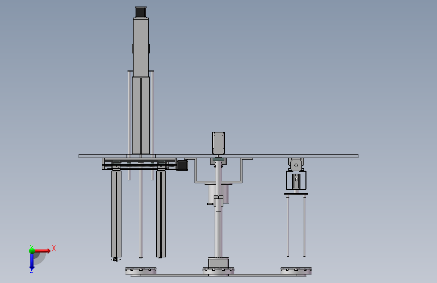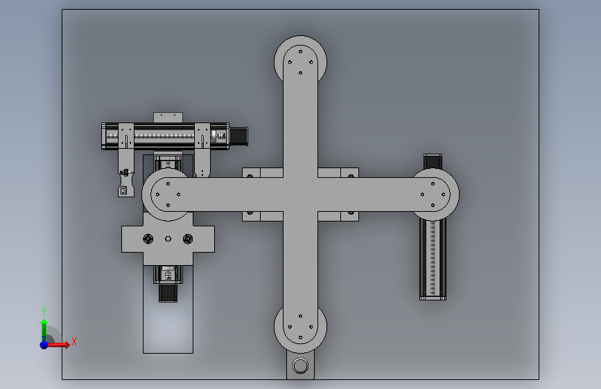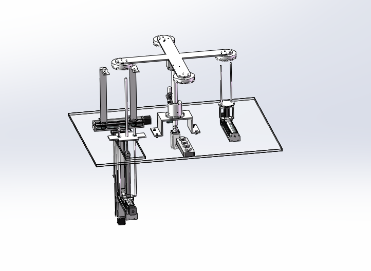 无刷电机冲片筛选装置底板上安装有中央旋转模组,右面有丝杆模组,左面有丝杆升降模组,升降模组还有一个气缸驱动的升降模块,侧面还有一个丝杆模组。