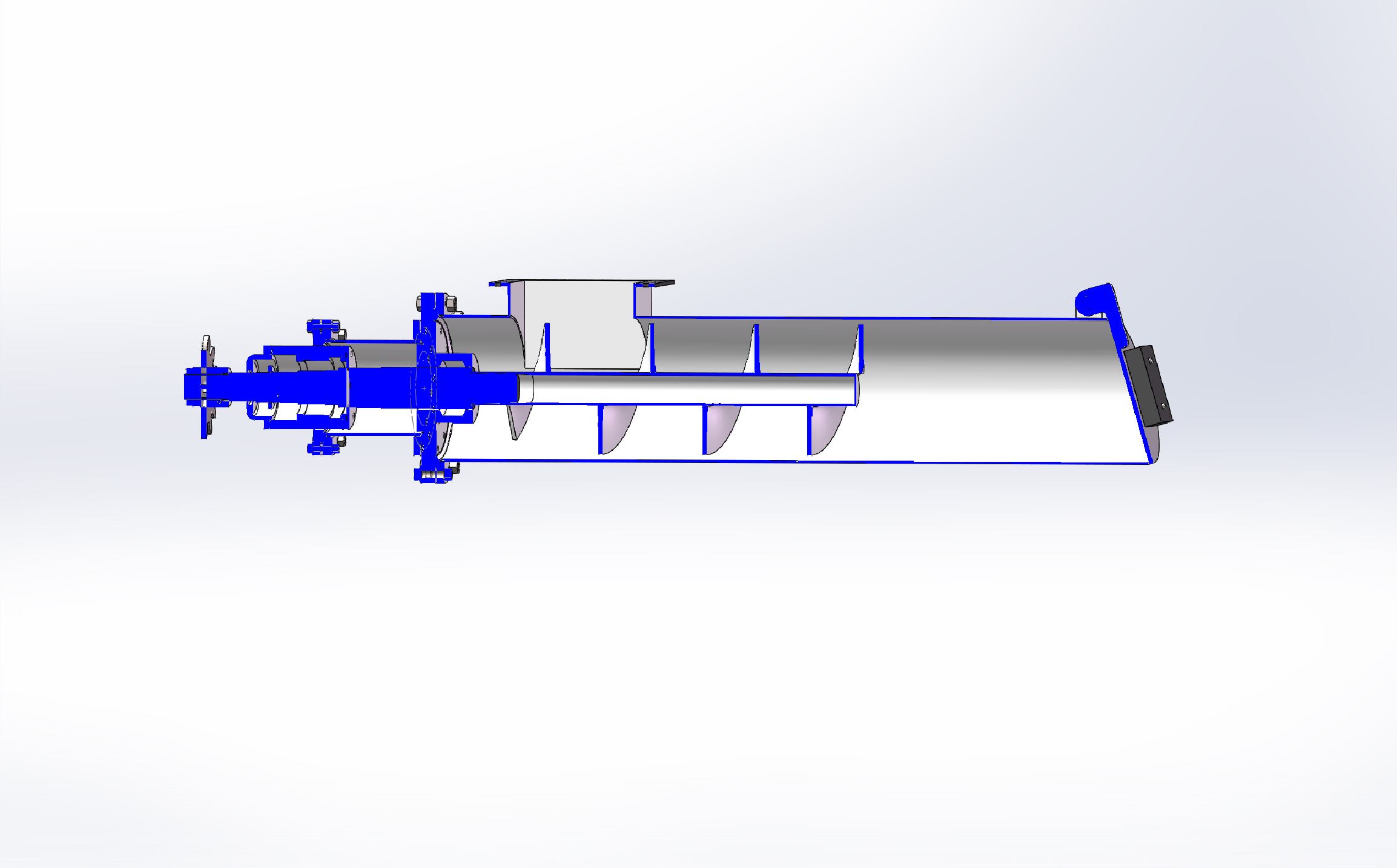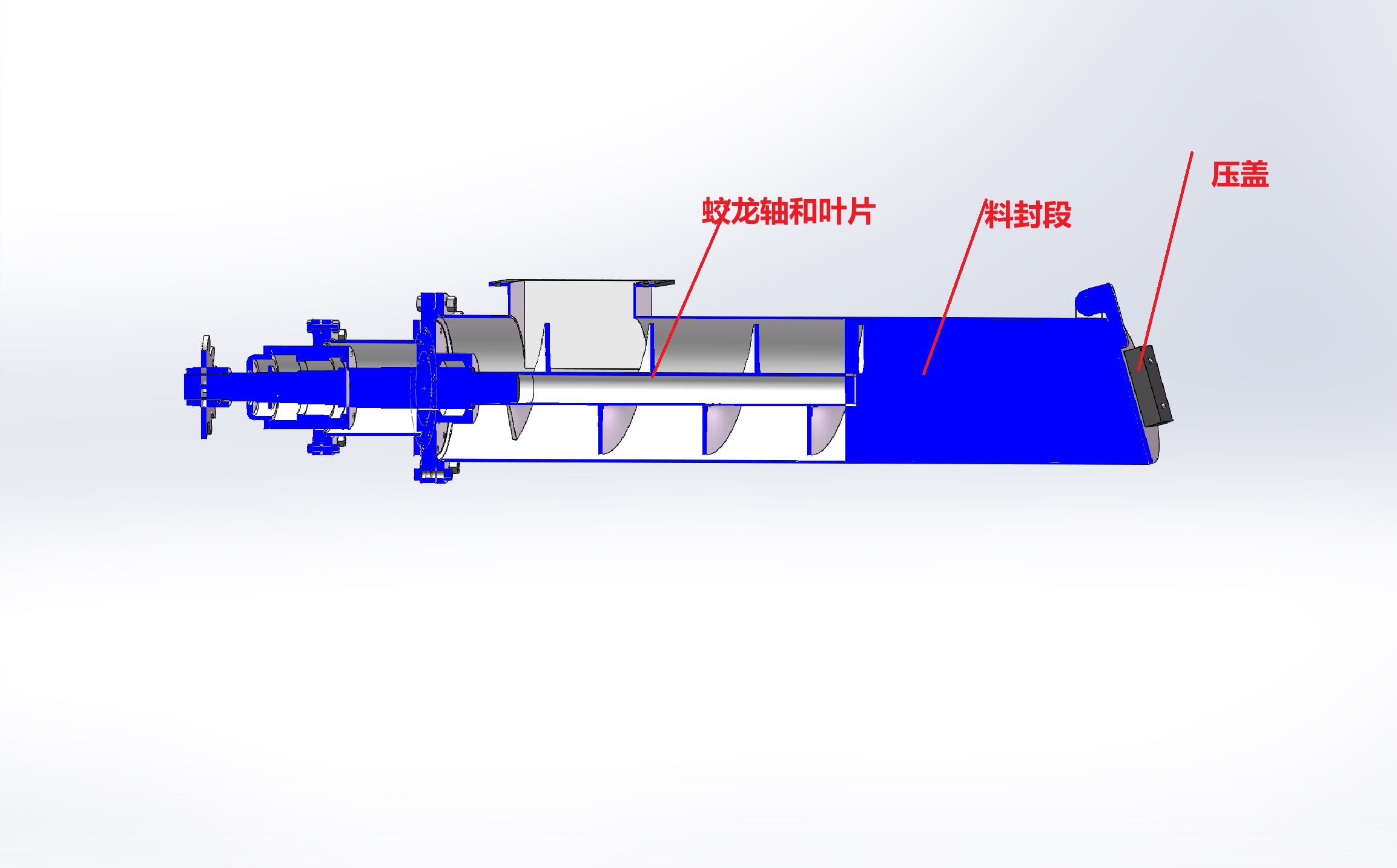结构原理:密封蛟龙主要由机架、绞龙机壳、绞龙轴、螺旋叶片、驱动电机、重力门等组成。内部的绞龙轴上安装有螺旋叶片,驱动电机带动绞龙轴旋转,使螺旋叶片推动物料沿机壳移动,实现物料的输送。为了达到密封效果,设有物料密封段,在绞龙叶片推动和挤压和重力门双重作用下,可使物料堆积紧密,对粉状和可压缩变形的物料,达到料封的目的。