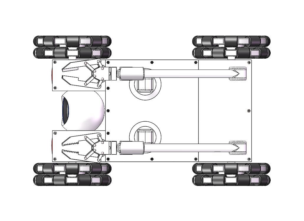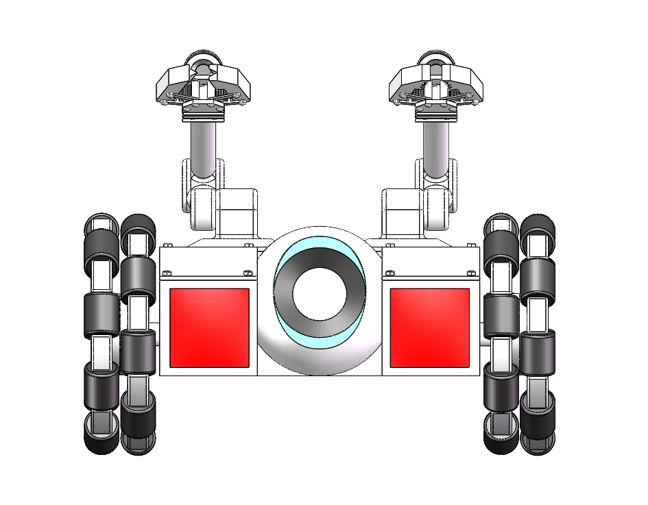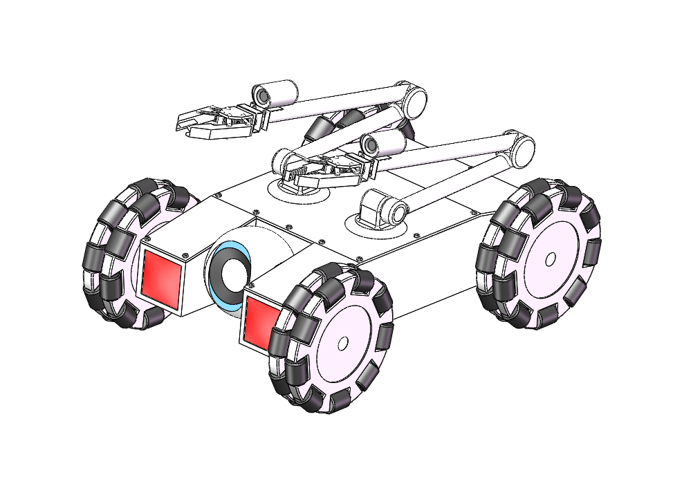 该模型是一款车轮式机械手机器人。车体上装有独立的摄像头,可上下摆动,用于行驶过程中,观察路况。车体上安装两个机械臂,分别装上剪钳和夹钳。剪钳可以剪断电线等物件、夹钳可以挟持物件,两机械臂配合工作可拆装炸弹。