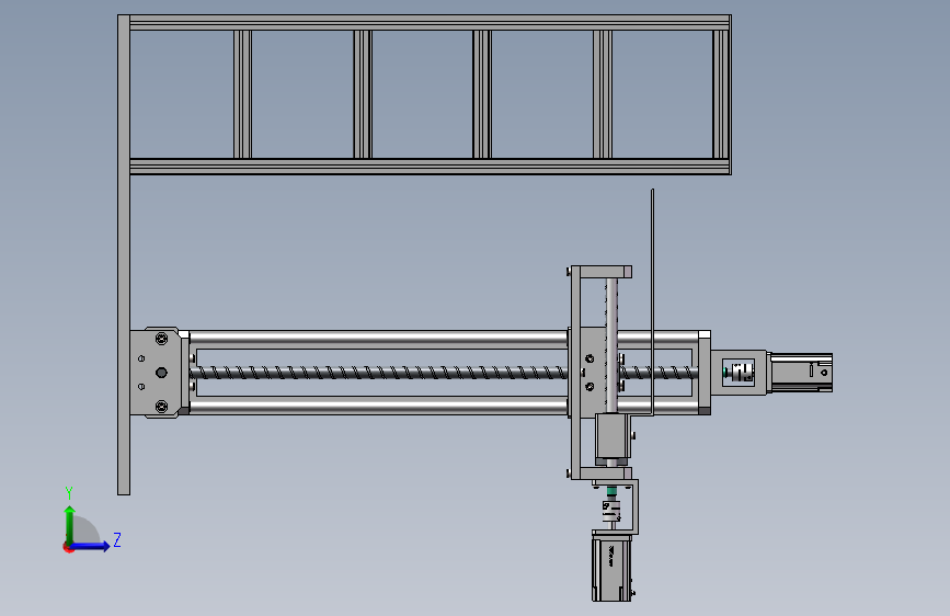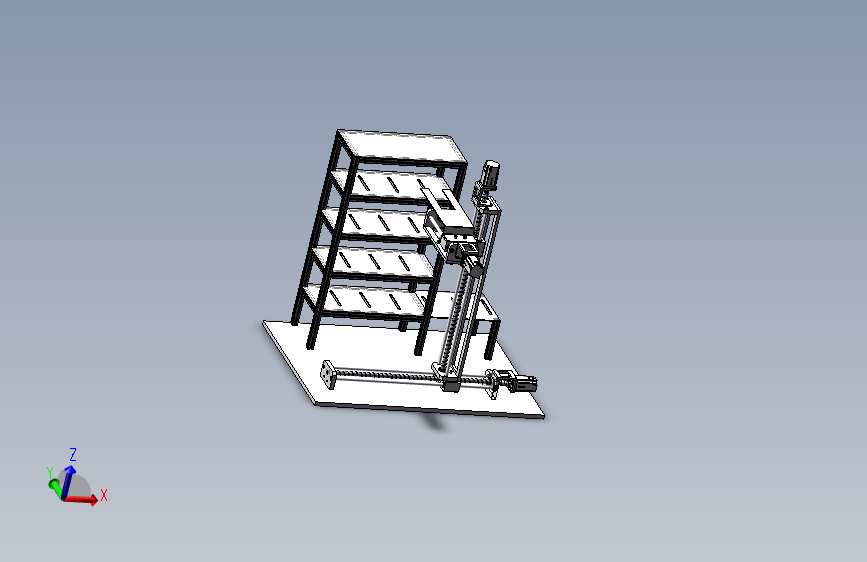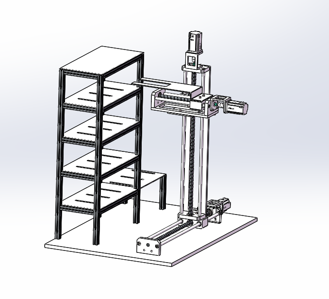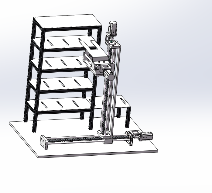 多层立体仓库是一种新型的仓库设备,由铝型材够成储存框架,侧面是三个自由度的机械手,三个自由度均采用丝杆机构进行驱动,行程各不相同,整体布局合理。
