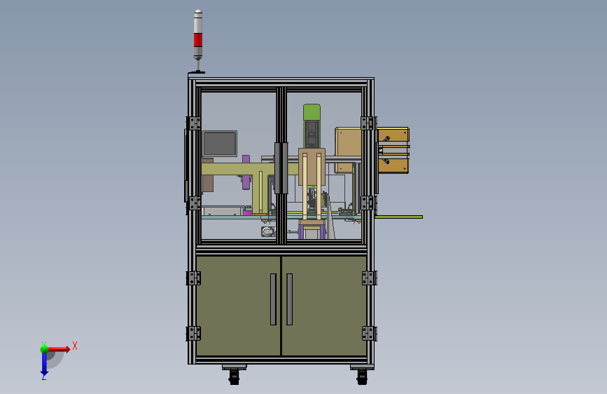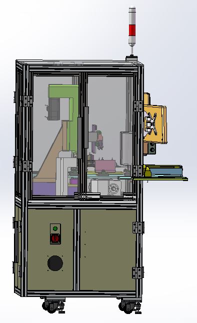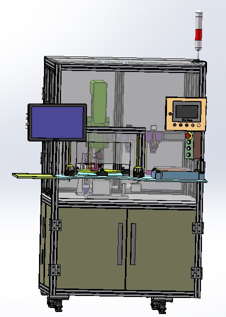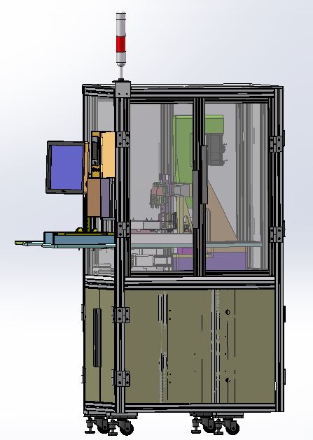 压装钢球工位3D模型,此压装钢球工位由型材和面板组成的工作台外框架,钢球压装工装、工作电脑和显示器、控制系统等组成,工作台底部装有带刹车的轮子,方便移动和定位。