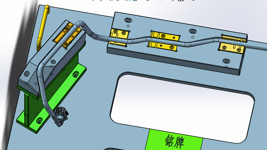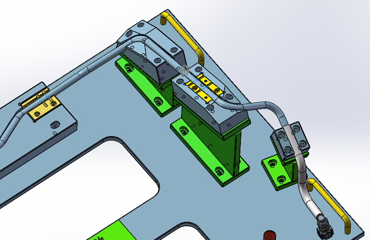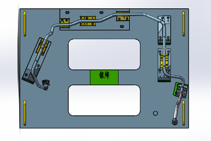 这是一套划线工装检具的三维模型图,工装是用于燃油管划线做记号、检测产品的。产品为汽车发动机供油管,需要划线做记号工序。划线工装的结构组成:安装底板、支撑座、尼龙治具和刻度公差指示牌。图纸格式为solidworks2018,欢迎大家来下载。