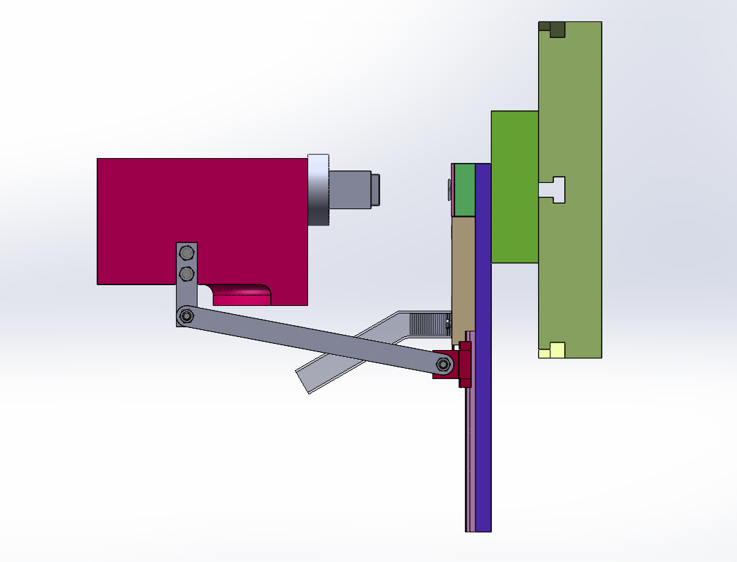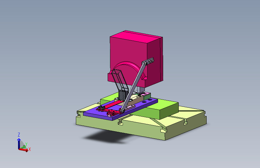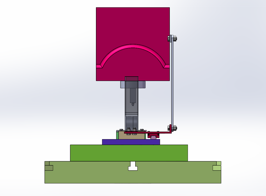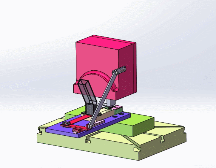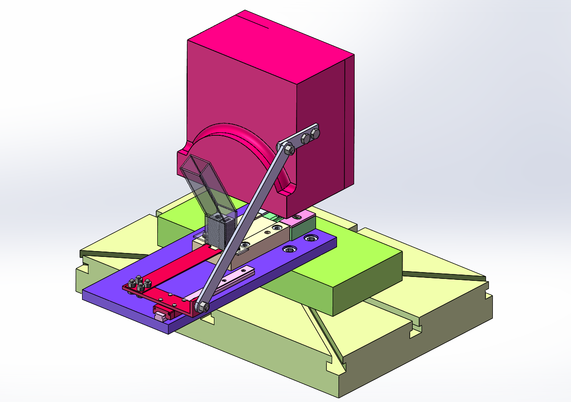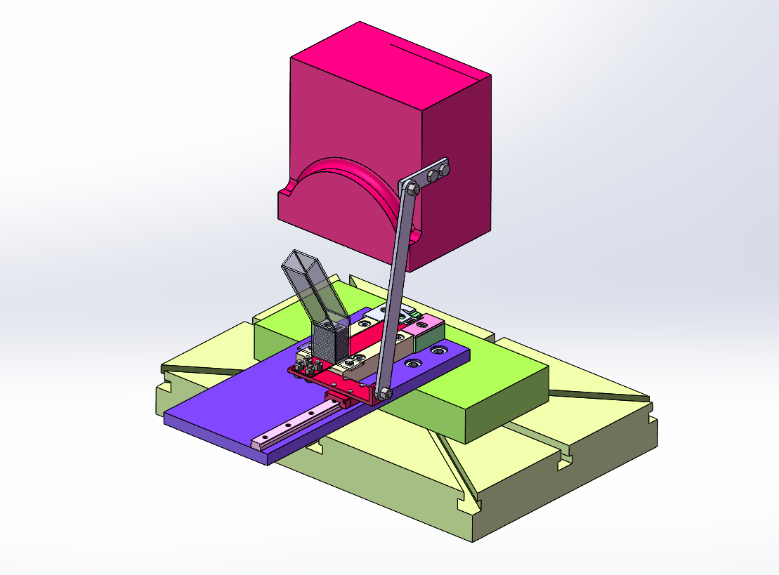 16T扬力冲床自动送料方案,此为汽车用支架产品的自动送料装置,模具是折弯模具,用连杆连接滑轨,使其能带动送料机构送料。连杆安装在冲床上滑块上,安装便捷。
