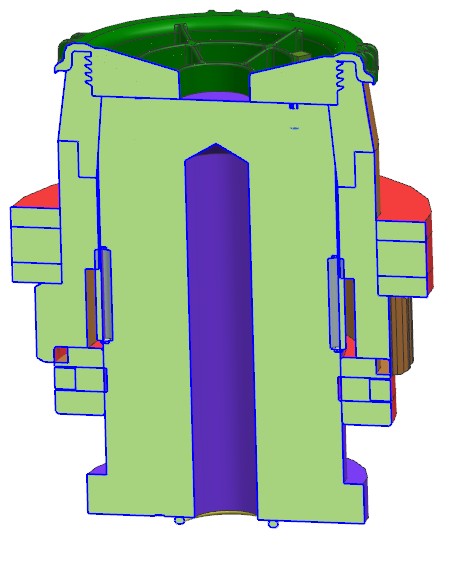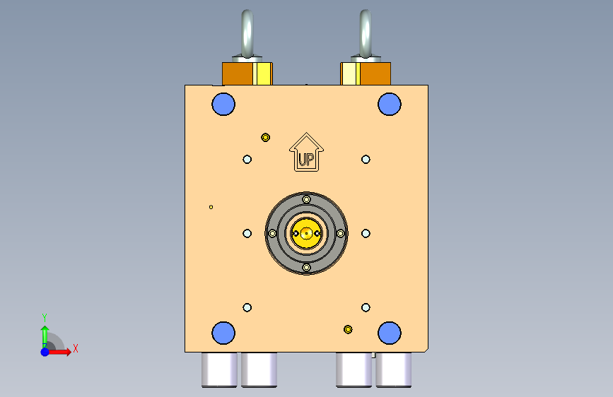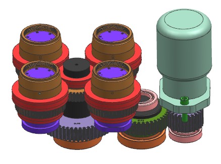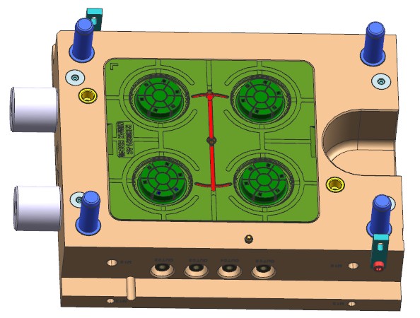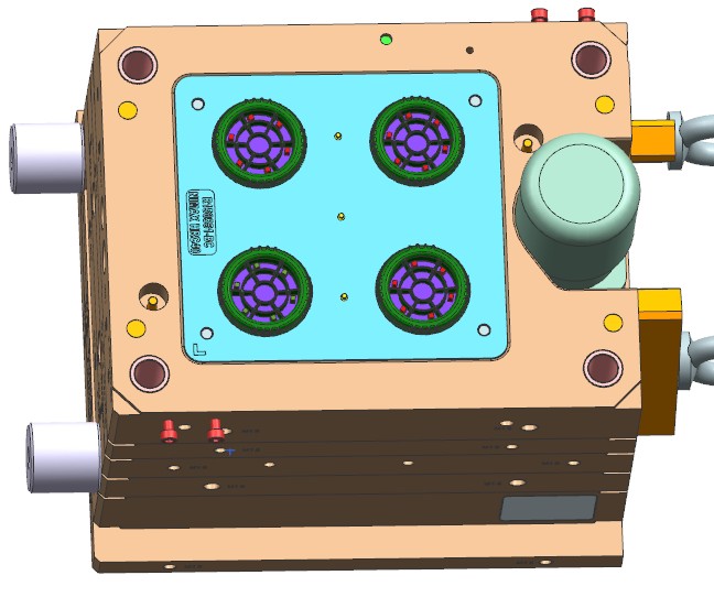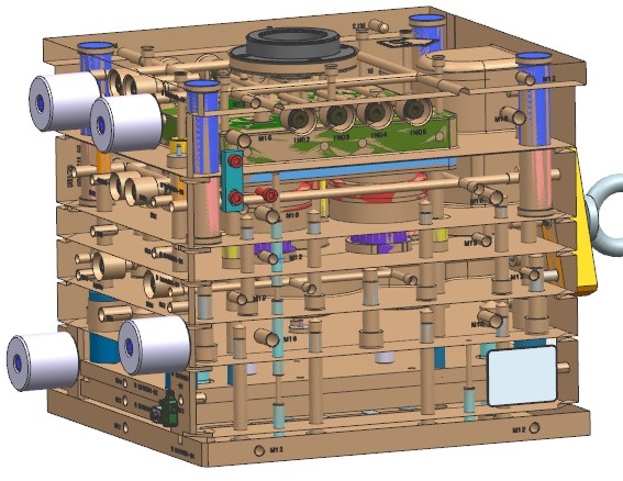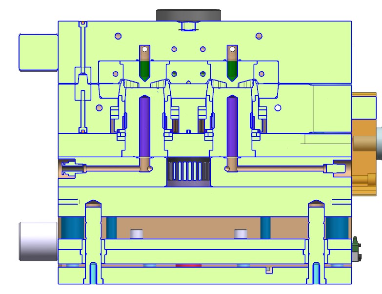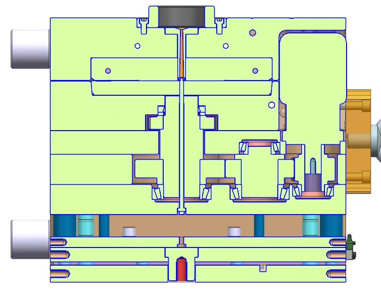 模具产品是洗碗机上的一个带有螺纹的配件。模具采用1X4排位布局,使用冷流道潜伏浇口进胶,脱螺纹采用的是液压马达带动多级齿轮的结构。此模具的结构特点是,设计了多个挡位镶件,阻挡产品随螺纹芯轴转动,最后用推板顶出。
