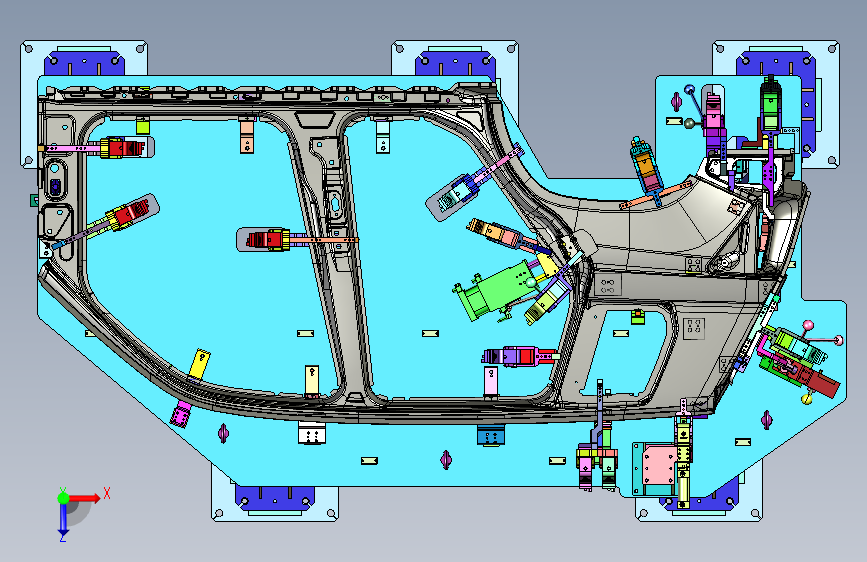 汽车侧围焊接总成组合夹紧工装:该工装通常包括多个夹紧装置,如气动夹具、定位压板等,它们可以实现对侧围各个部位的夹紧和定位。同时,该工装还配备有各种传感器和检测装置,