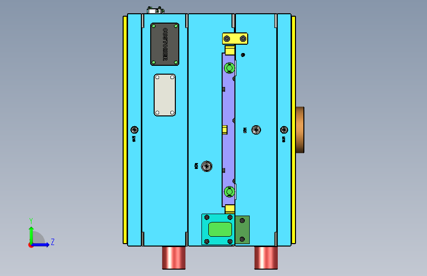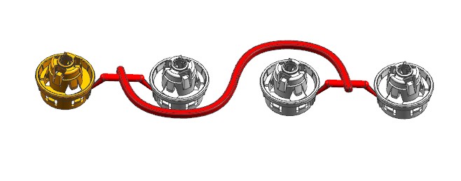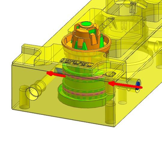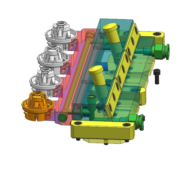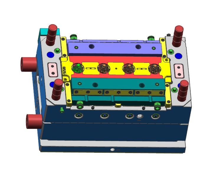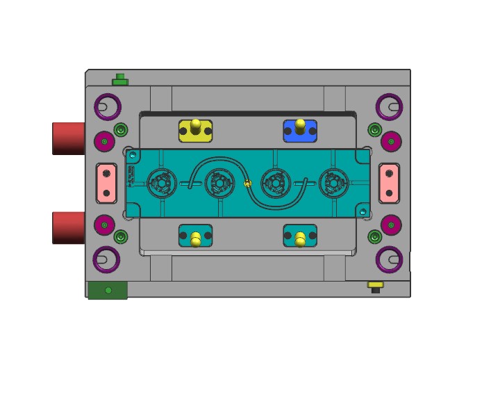 此结构件有四个卡扣朝四个方向,为便于滑块出模,四个卡扣调整为两个方向。圆柱形镶件的冷却,使用直通冷却水,上下使用密封圈密封的结构。模具布局1出4,潜伏浇口进胶,滑块机构脱倒扣。