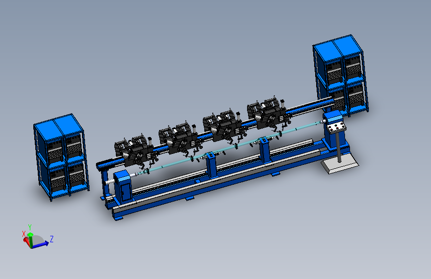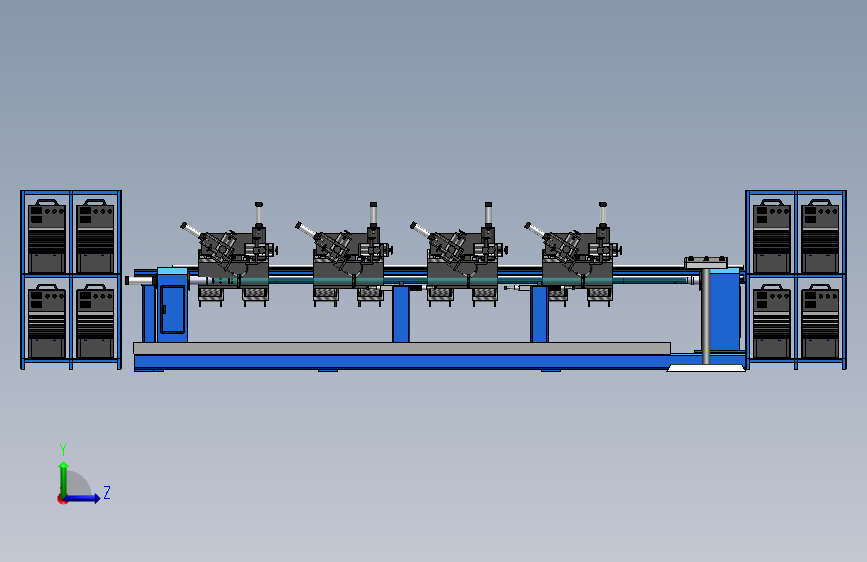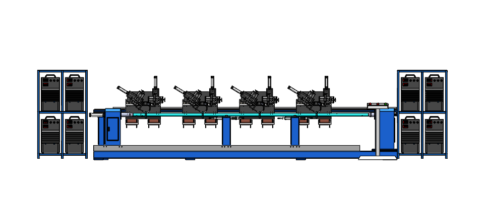 该设备主要用于脚手架支柱焊接;该工装采用半自动工作方式,人工将工件吊装至工装位置,先由主动端的工装将工件初步固定,再利用中间的支撑架支撑,最后由尾座的自定心工装将工件自动夹紧,定位完成,启动焊接并完成焊接。