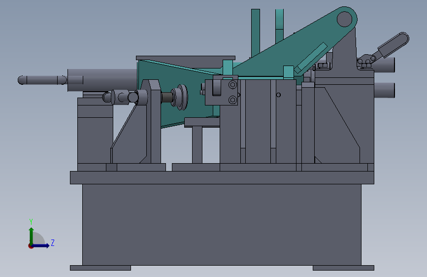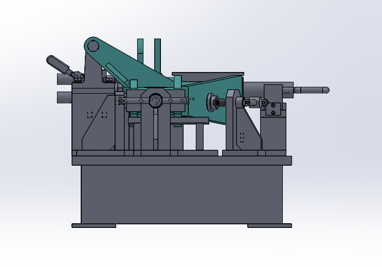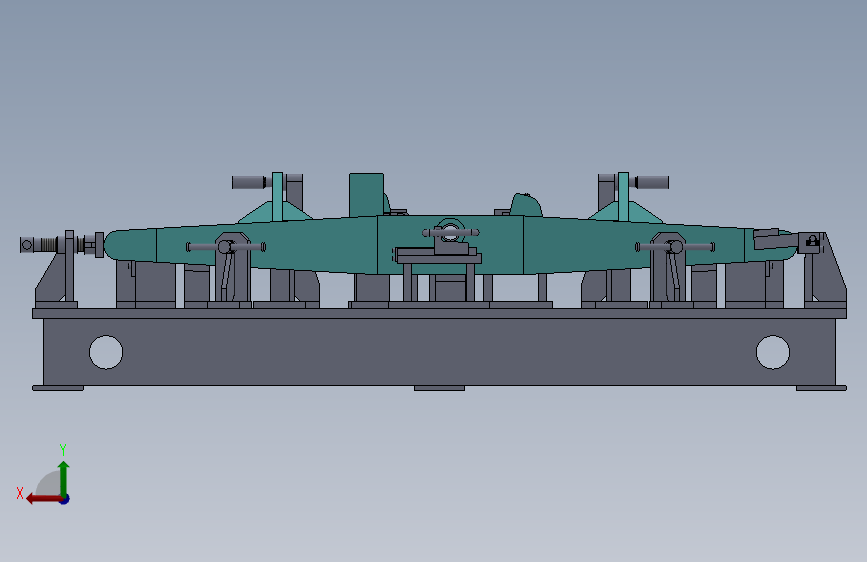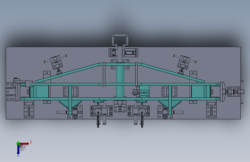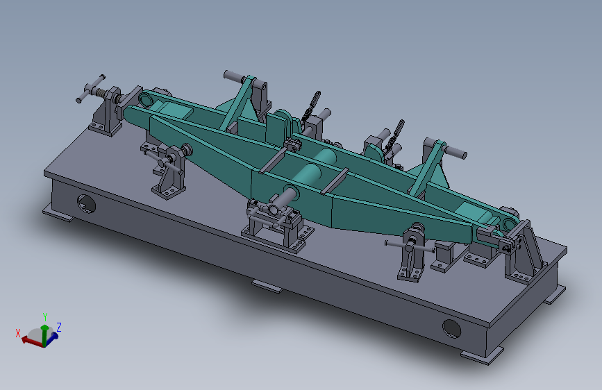 该工装采用平台式结构,主要组成部分有:平台、支承座、定位座、高度支承、销轴、穿轴定位装置、辅助定位装置、仿形定位装置、撑开装置、滑块、顶紧装置、快速夹钳等。