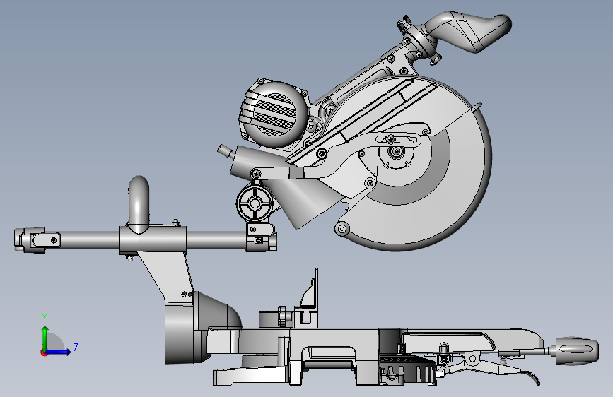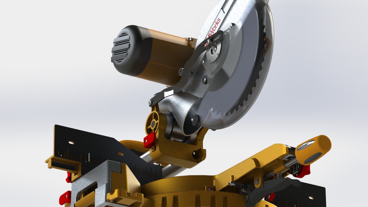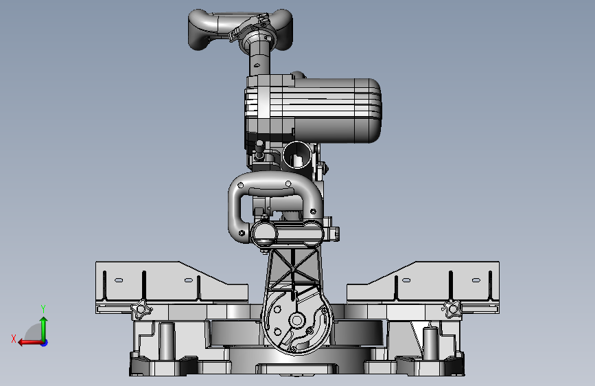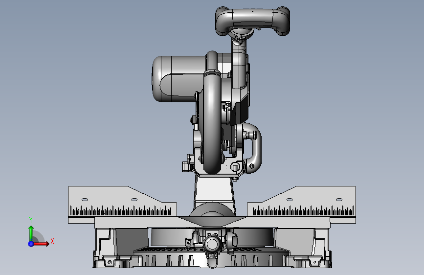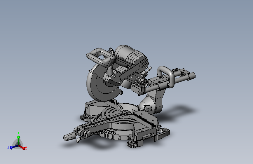 这是一个带刻度斜切钜的三维模型,该设备主要是由底座、刀具调节装置、刀具动力装置、带刻度工作台以及夹具等组成,