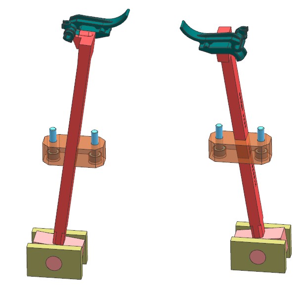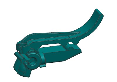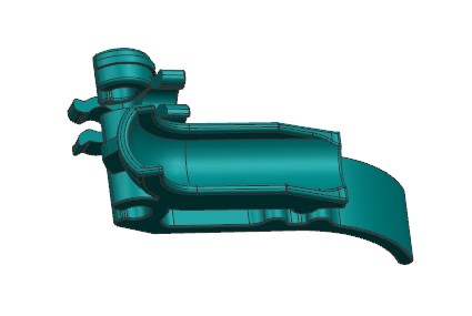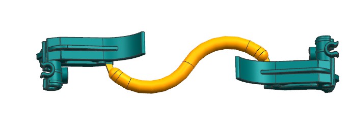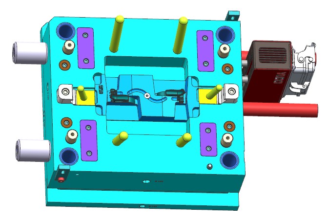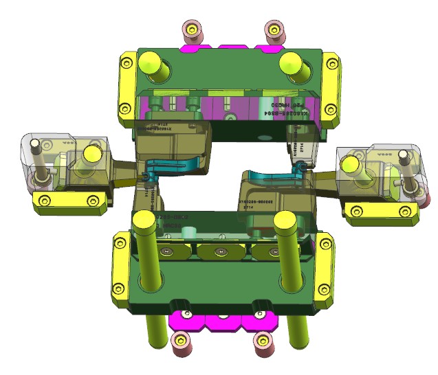 本例是一款洗碗机内部结构卡扣,产品虽小但结构复杂。模具采用1出2布局,因产品间隔较远,采用S型流道侧浇口进胶。产品四面倒扣,三面使用滑块结构,中间为留出流道空间,使用斜顶抽芯。两侧滑块需要与前模擦破,需要设计擦破角度。